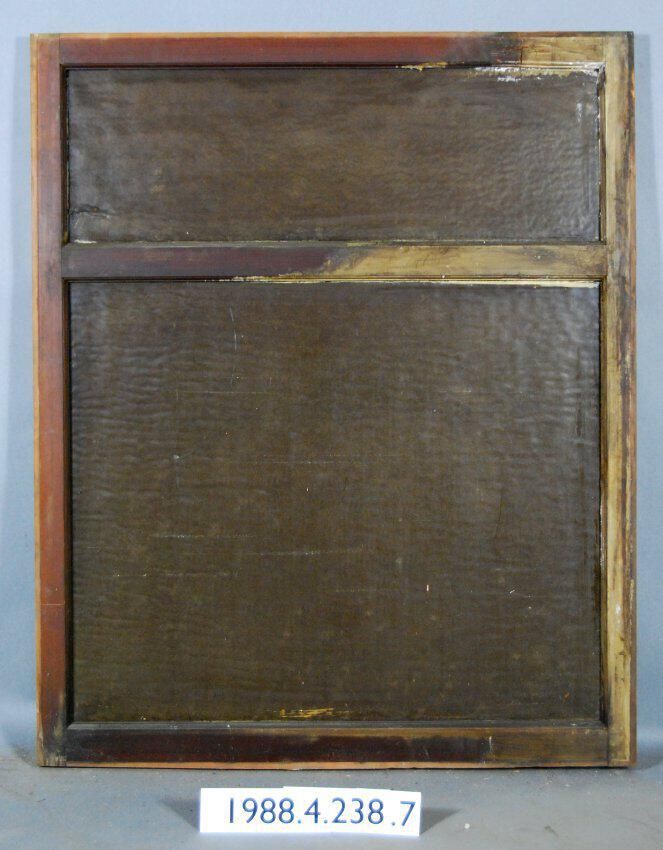 Rectangular. Mortice and tenon and coped joints. Two openings divided by mullion. Both with complete colorless pressed, molded glass panes. Ripple pattern. Type: Fixed sash Inscriptions or Markings: Manufacturer: Place of Manufacturer: Design motif: Style: Finish: Varnished