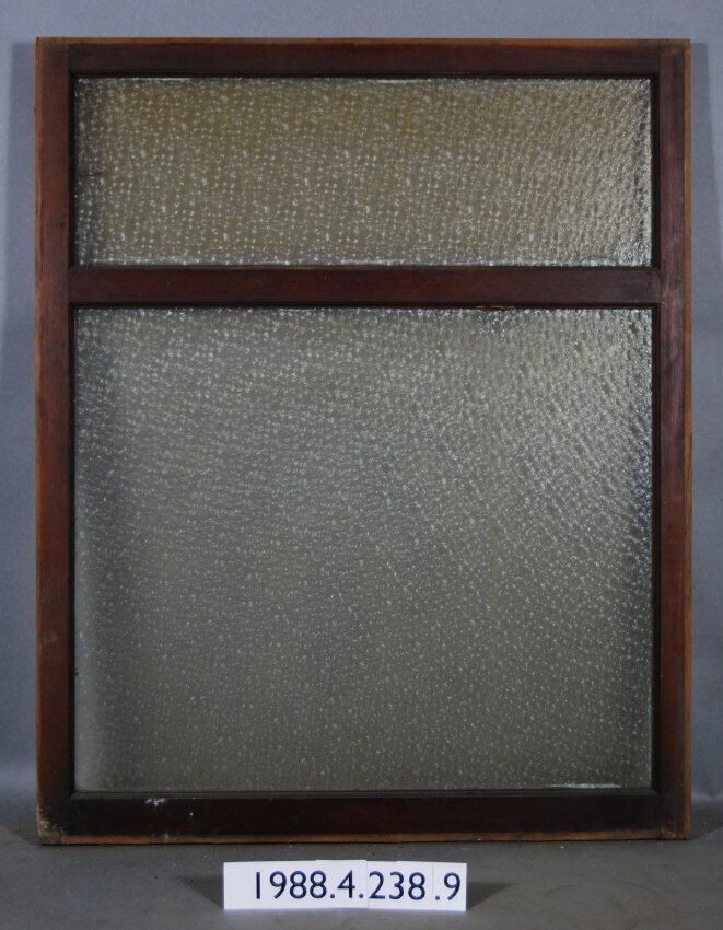 Rectangular. Mortice and tenon and coped joints. Two openings divided by mullion. Both with complete colorless pressed, molded glass panes. Botanical pattern.