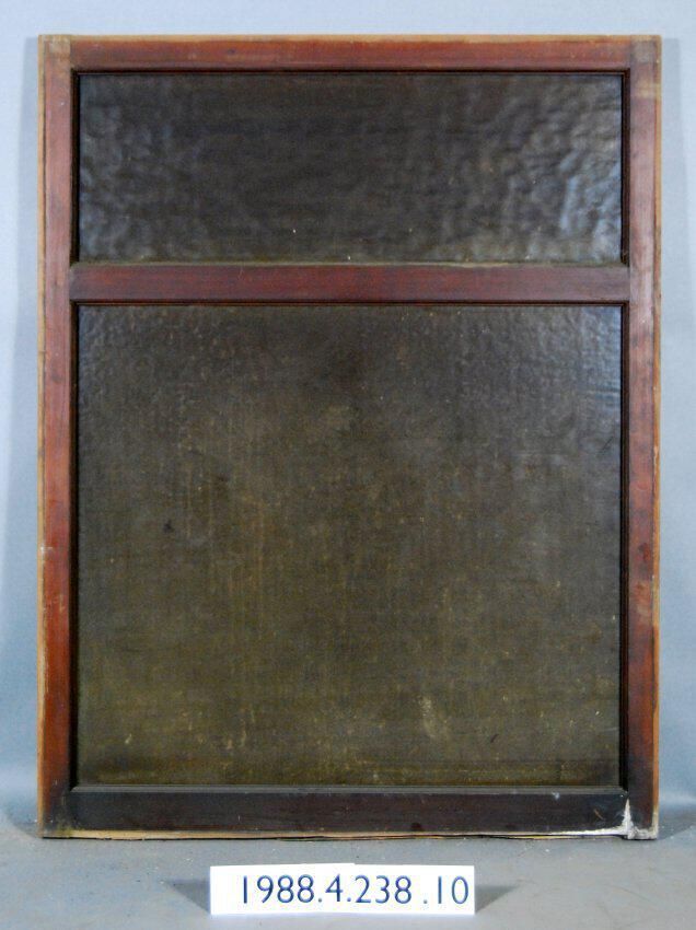 Rectangular. Mortice and tenon and coped joints. Two openings divided by mullion. Both with complete colorless pressed, molded glass panes. Ripple pattern. Type: Fixed sash Inscriptions or Markings: Manufacturer: Place of Manufacturer: Design motif: Style: Finish: Varnished