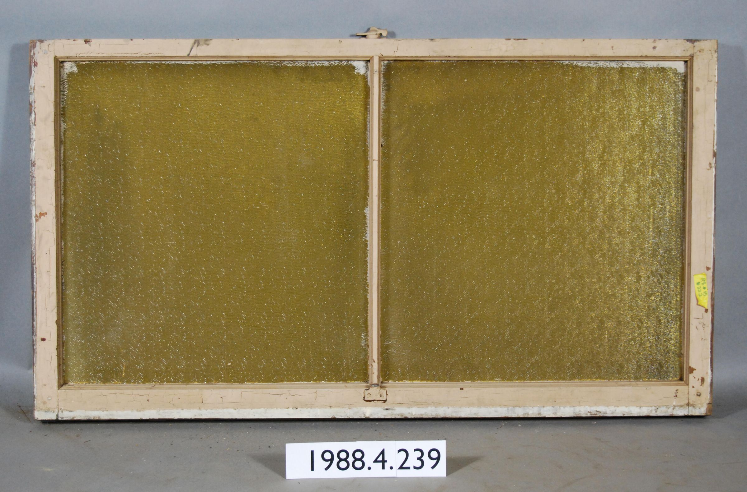 Rectangular. Mortice and tenon and coped joints. Two openings divided by vertical muntin. Both with complete amber colored pressed, molded glass panes. Ripple pattern. Has latch hardware and tab handle.