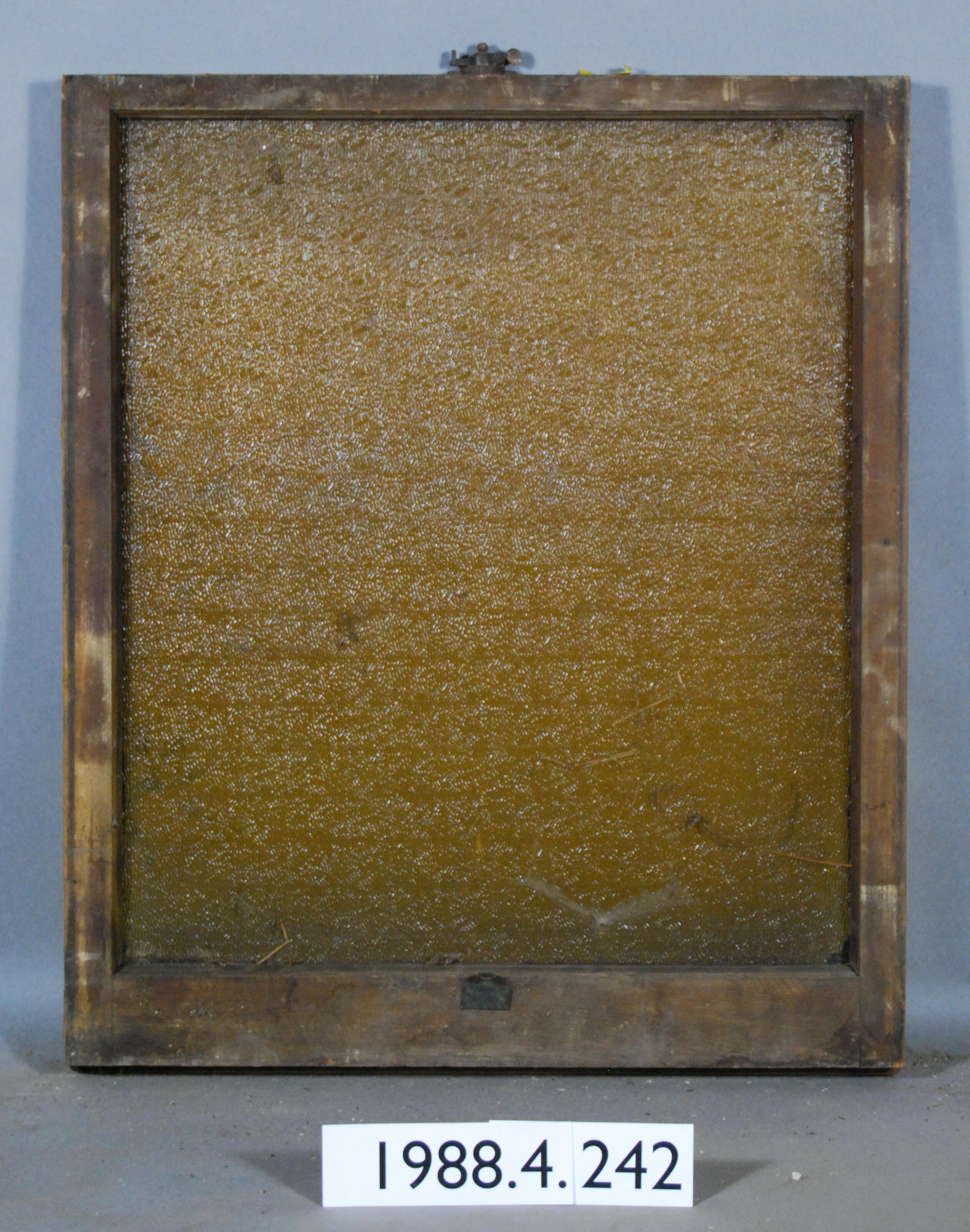 Rectangular. Mortice and tenon and coped joints. One opening with broken amber colored pressed, molded glass pane. Ripple pattern. Has latch hardware and tab handle.
