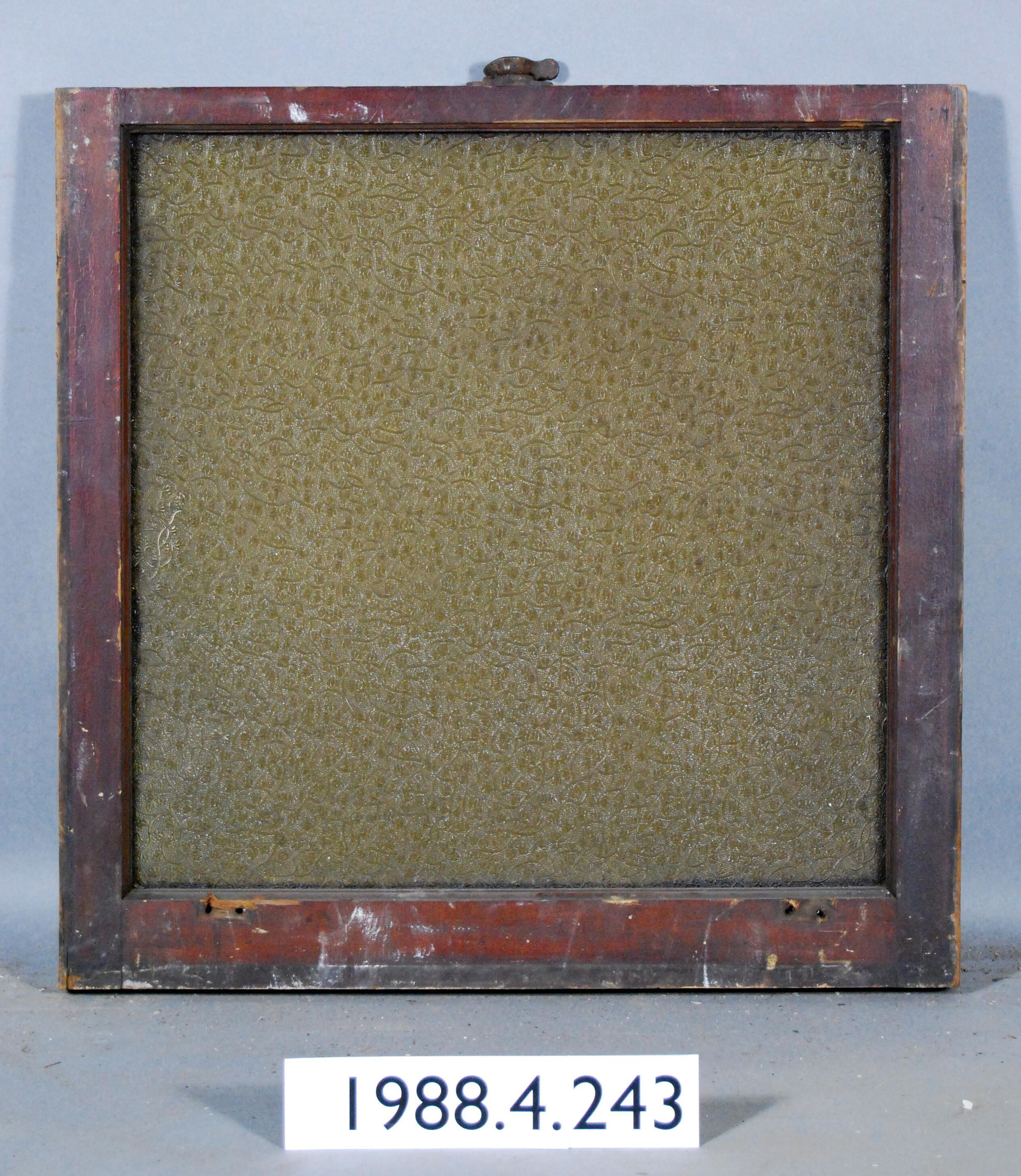 Rectangular. Mortice and tenon and coped joints. One opening with complete amber colored pressed, molded glass pane. Botanical motif pattern. Has latch hardware. Handles are missing. Type: Double hung, bottom sash Inscriptions or Markings: Manufacturer: Place of Manufacturer: Design motif: Botanical Style: Finish: Painted / Varnished