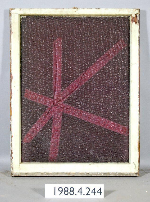 Rectangular. Mortice and tenon and coped joints. One opening with broken purple tint colored pressed molded glass pane. Botanical motif pattern. Incomplete latch hardware. Type: Double hung, bottom sash Inscriptions or Markings: Manufacturer: Place of Manufacturer: Design motif: Botanical Style: Finish: Painted
