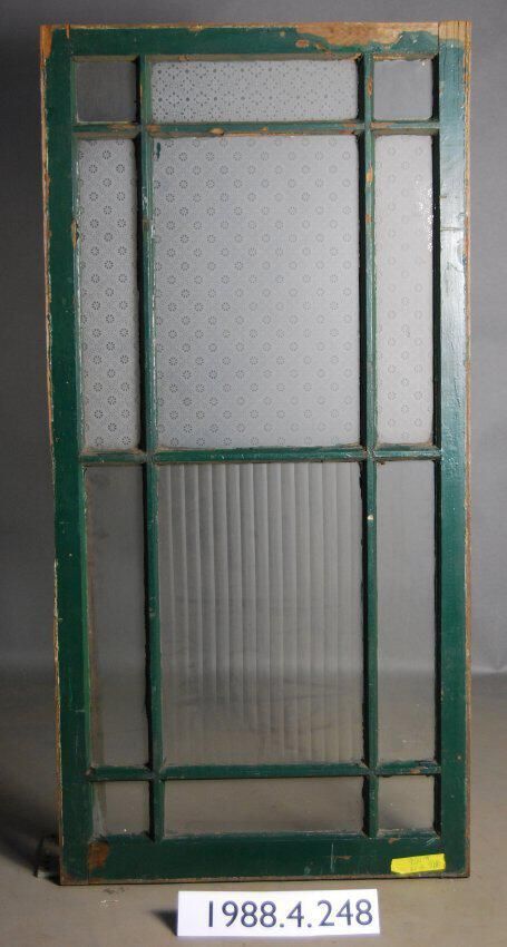 Rectangular. Mortice and tenon and coped joints. Segmented twelve openings. Four have complete colorless attached glass panes. One opening has colorless wide reeded glass pane. Remaining seven with complete colorless clear glass panes.