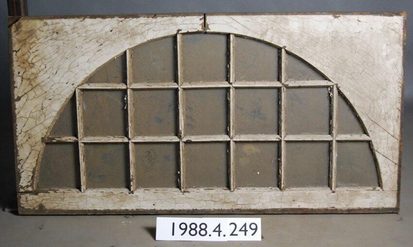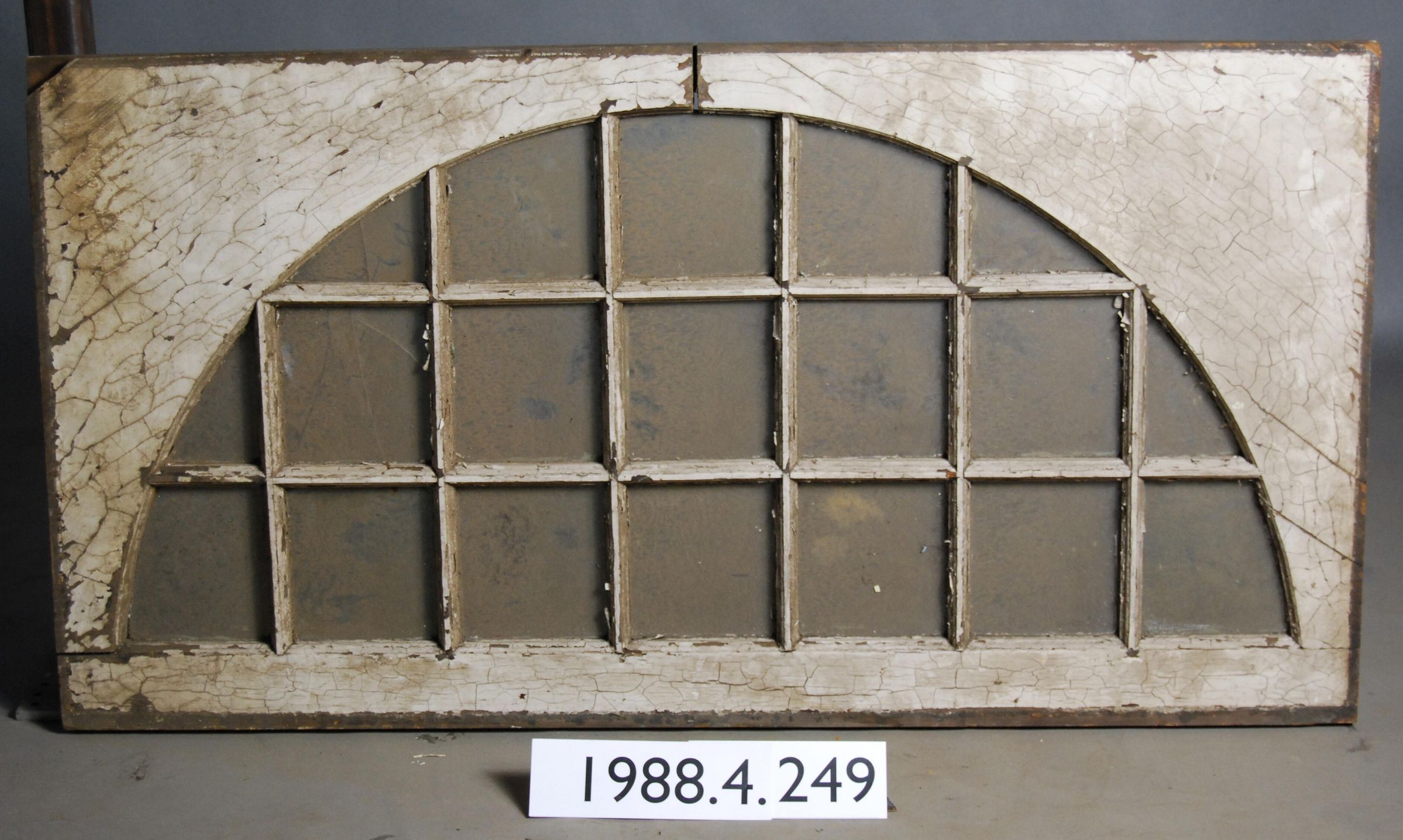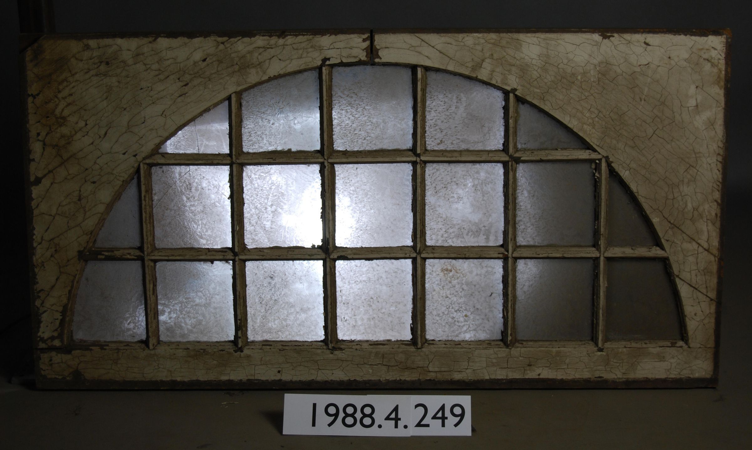 Rectangular. Semi-circular opening. Segmented into nineteen smaller openings. All with complete colorless glue-chipped window panes. Two are cracked.