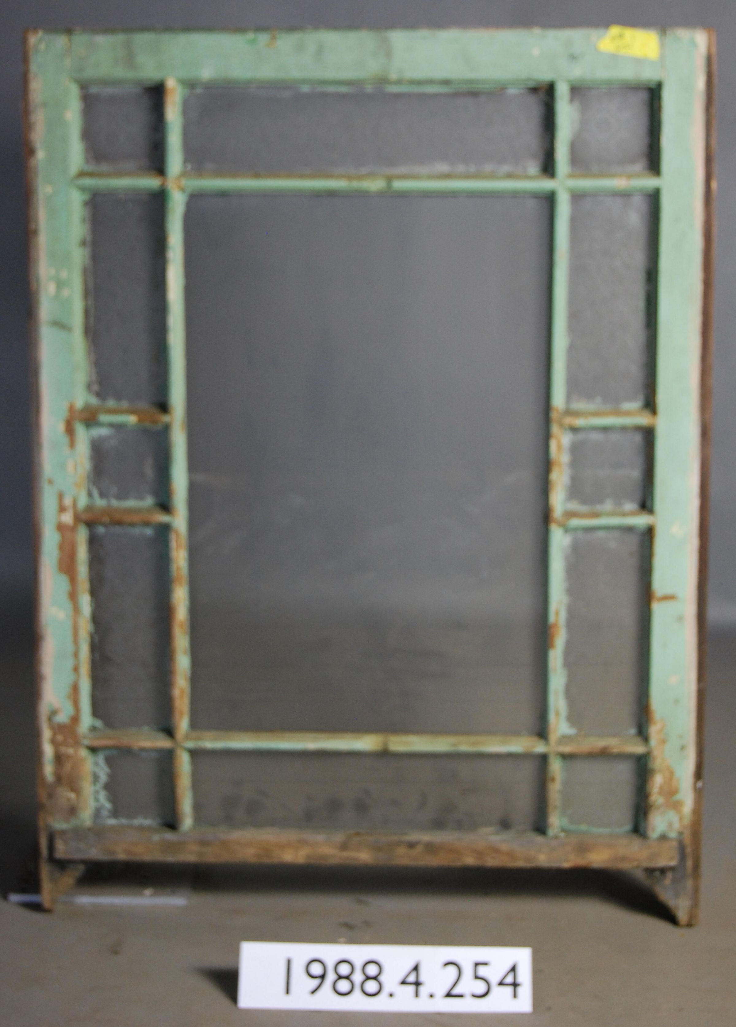 Rectangular. Mortice and tenon and coped joints. Segmented thirteen openings. Six with complete glue chipped glass panes. Six complete etched glass panes. One complete colorless glass pane. Latch hardware missing. Has ogee lugs.