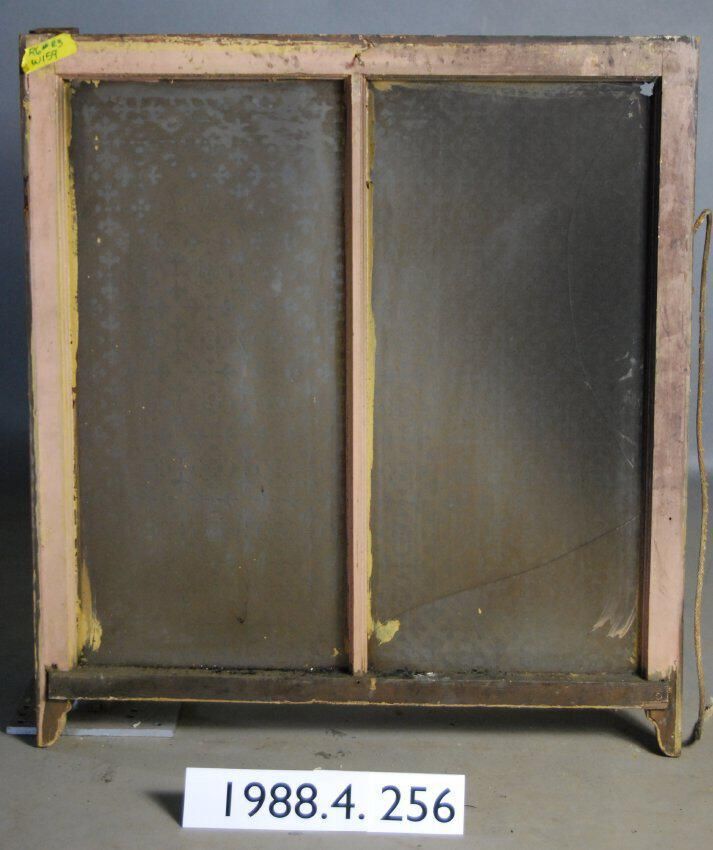 Rectangular. Mortice and tenon and coped joints. Two openings divided by vertical muntin. One complete glass pane. One broken glass pane. Both are etched with geometric / botanical motif. Has ogee lugs.