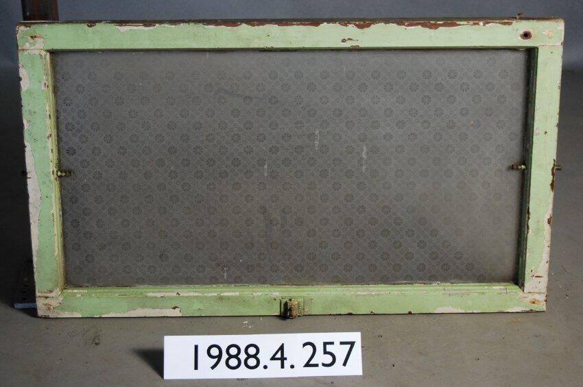 Rectangular. Mortice and tenon and coped joints. Complete etched glass pane with geometric / botanical motif. Has two spring bolts. One spring latch.