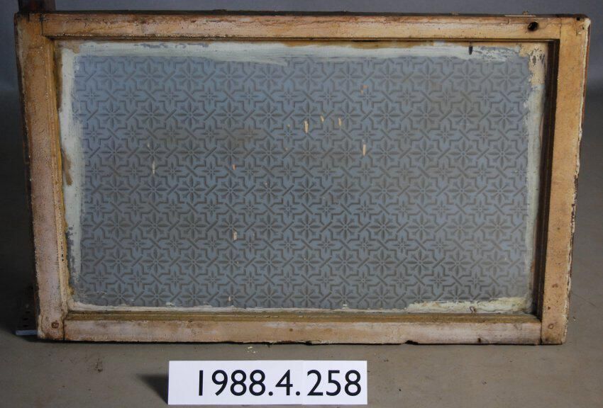 Rectangular. Mortice and tenon and coped joints. (broken) etched glass pane with geometric / botanical motif. Has hole drilled through sash.