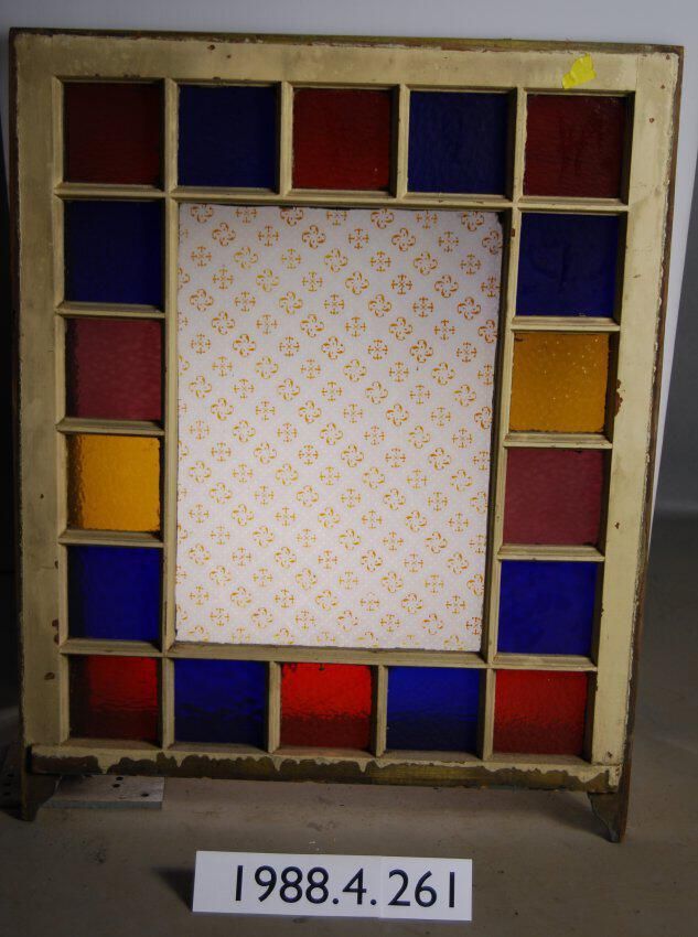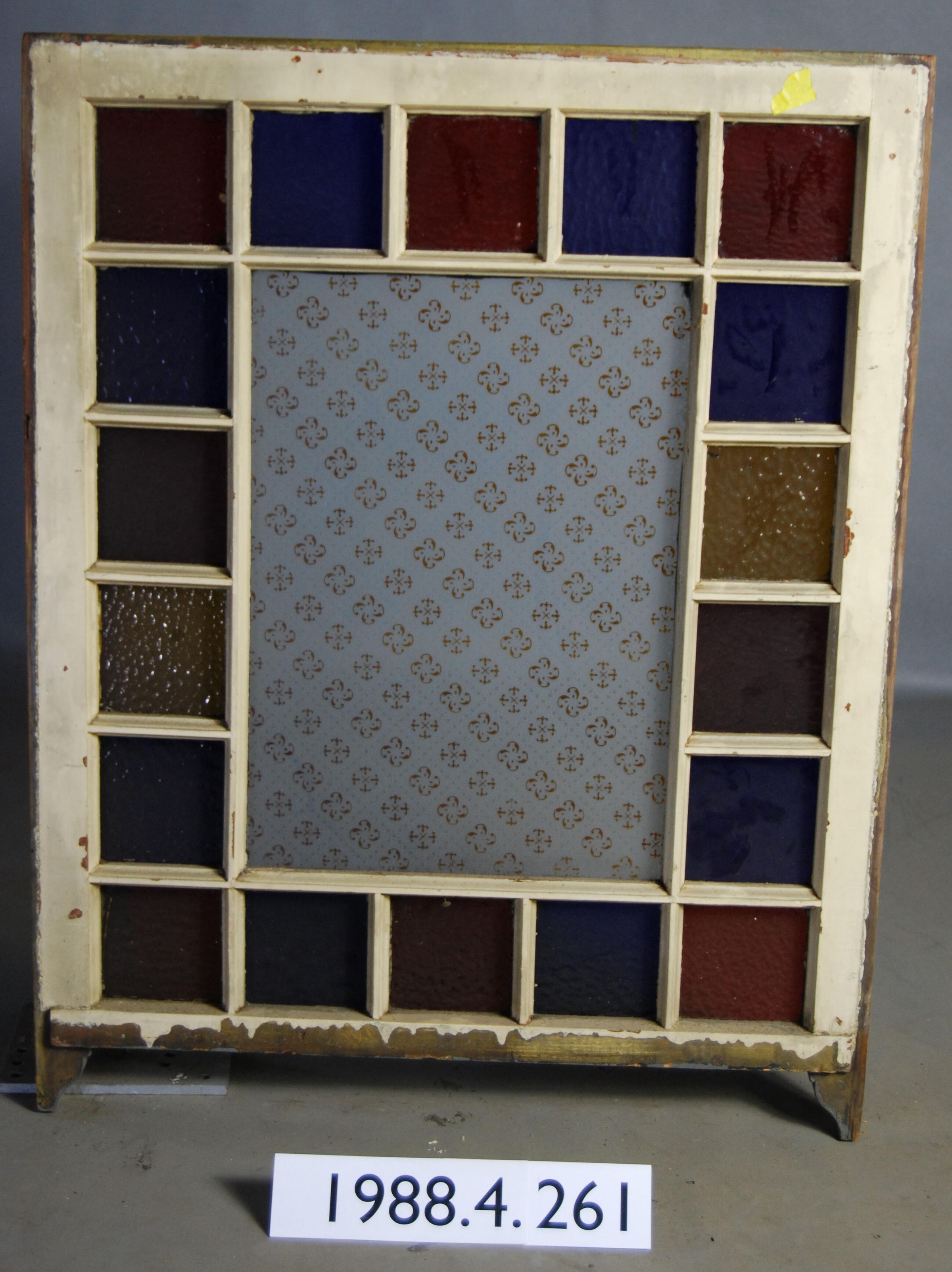 Rectangular. Mortice and tenon and coped joints. Segmented nineteen openings divided by muntins. Includes six red, two amber, two purple, and eight blue glass panes. All complete. One blue pane is cracked. Central pane is colorless etched glass pane with geometric / botanical motif. Has ogee lugs.
