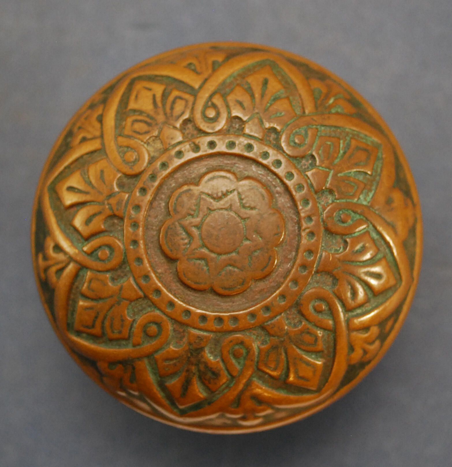 Design Name: Manufacturer: Russell & Erwin Mfg. Co. Style: Neo-Grec Material: Bronze Manufacturing Method: Wrought / Stamped Surface Finish: Unpolished VDA Classification: Eightfold Symmetry VDA Number: K - 104 Shape: Domed Patent Specifics: Lock Type (If Applicable): Inscription/Makers Mark: Inscription Text: Comments: