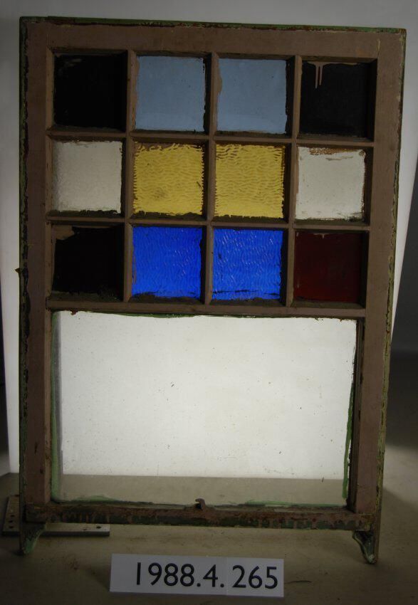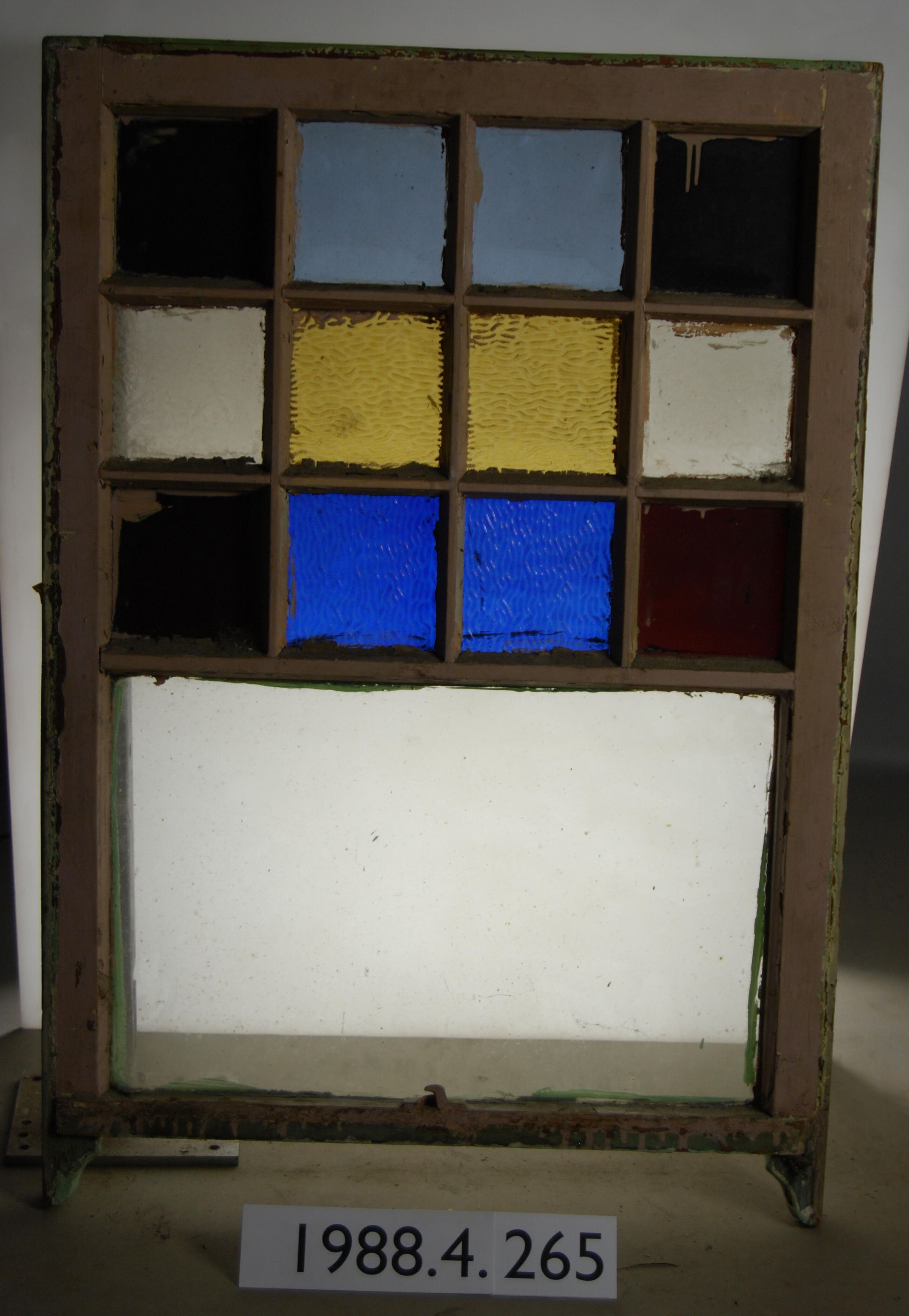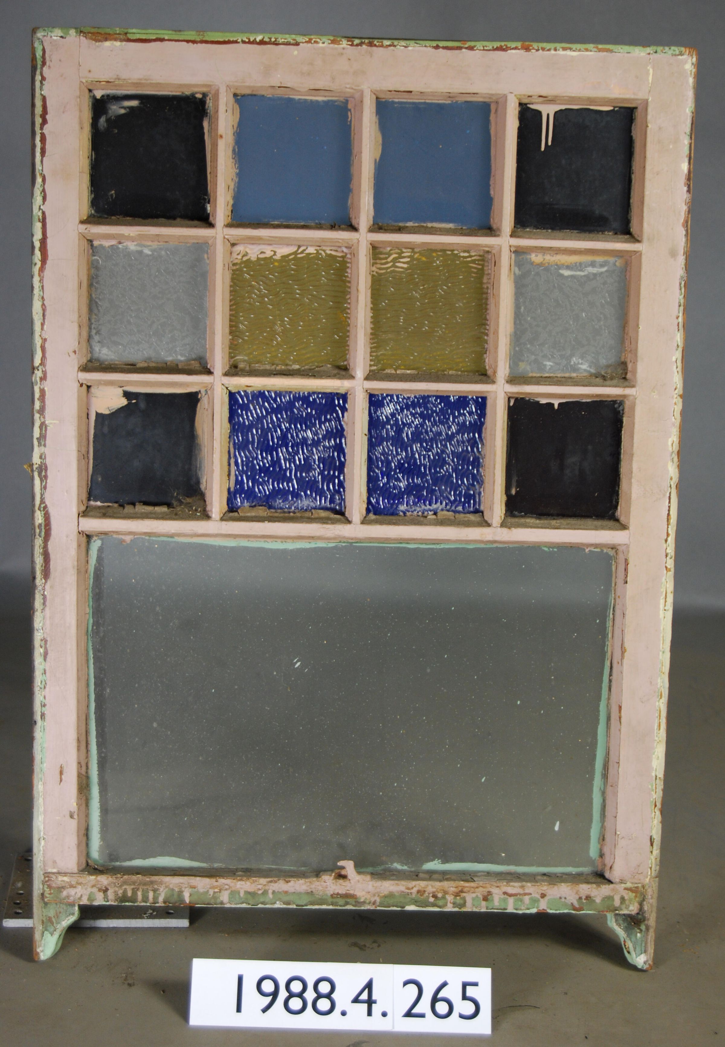 Rectangular. Mortice and tenon and coped joints. Segmented thirteen openings divided by muntins. Includes four red flashed glass panes. Two colorless glue chipped panes. Two light blue panes. Twpoamber colored machine rolled rippled panes and two dark blue machine rolled rippled panes below which is colorless complete pane. Has latch hardware. Has ogee lugs.
