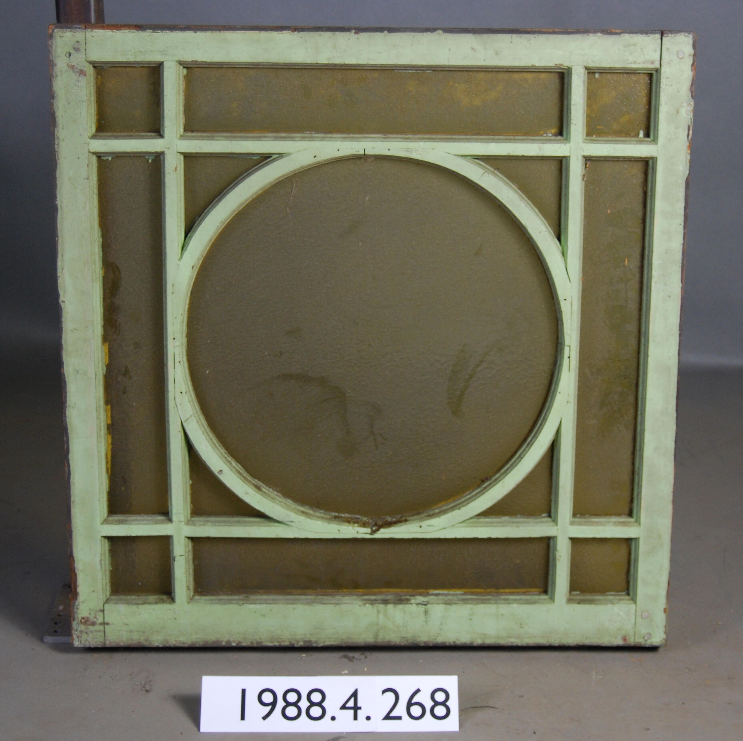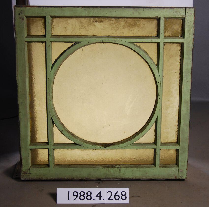 Rectangular. Mortice and tenon and coped joints. Segmented thirteen openings divided by muntins. All with complete amber colored glass panes. Central opening is circular. Type: Double hung bottom sash Inscriptions or Markings: Manufacturer: Place of Manufacturer: Design motif: Style: Finish: Painted