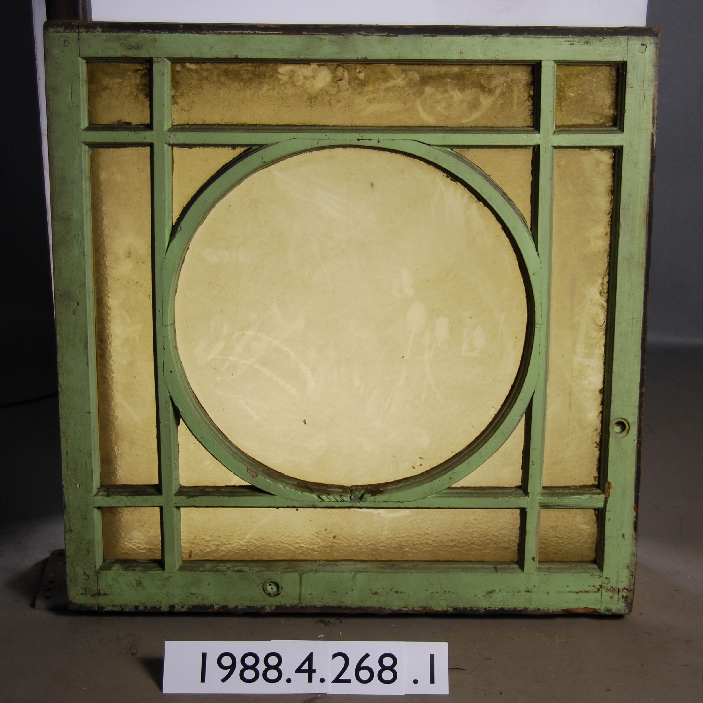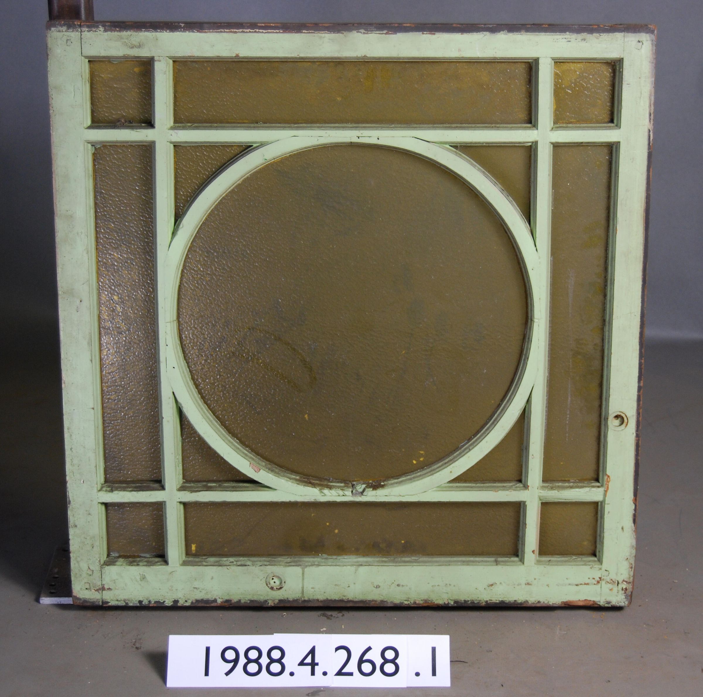 Rectangular. Mortice and tenon and coped joints. Segmented thirteen openings divided by muntins. All with complete amber colored glass panes. Central opening is circular.
