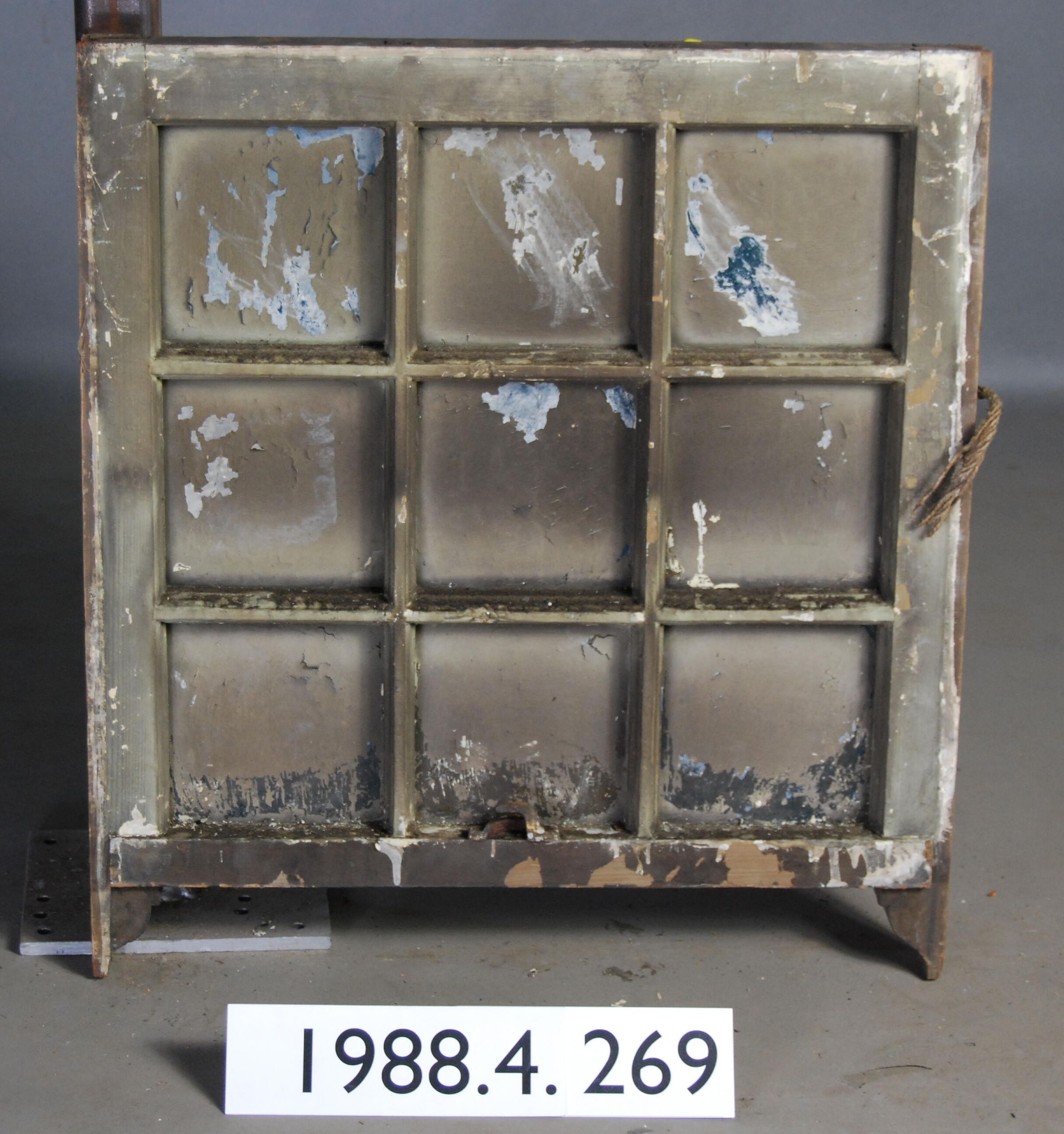 Rectangular. Mortice and tenon and coped joints. Segmented nine openings divided by muntins. Includes five blue glass panes and four amber colored glass panes. All are complete but painted over. Has latch hardware. Ogee lugs.