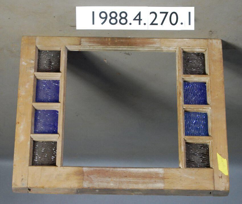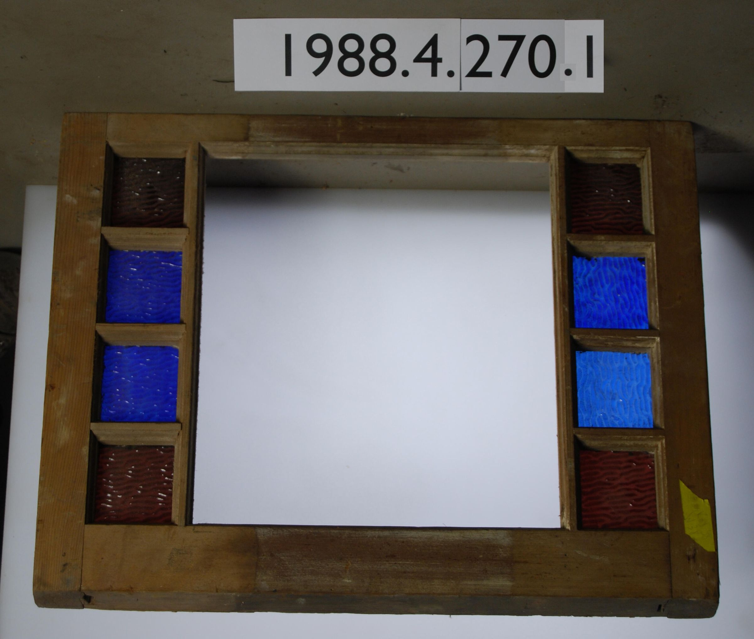 Rectangular. Mortice and tenon and coped joints. Segmented nine openings divided by muntins. Machine rolled. Rippled glass panes include: Four wine colored glass panes, and four blue panes. Central pane is missing.