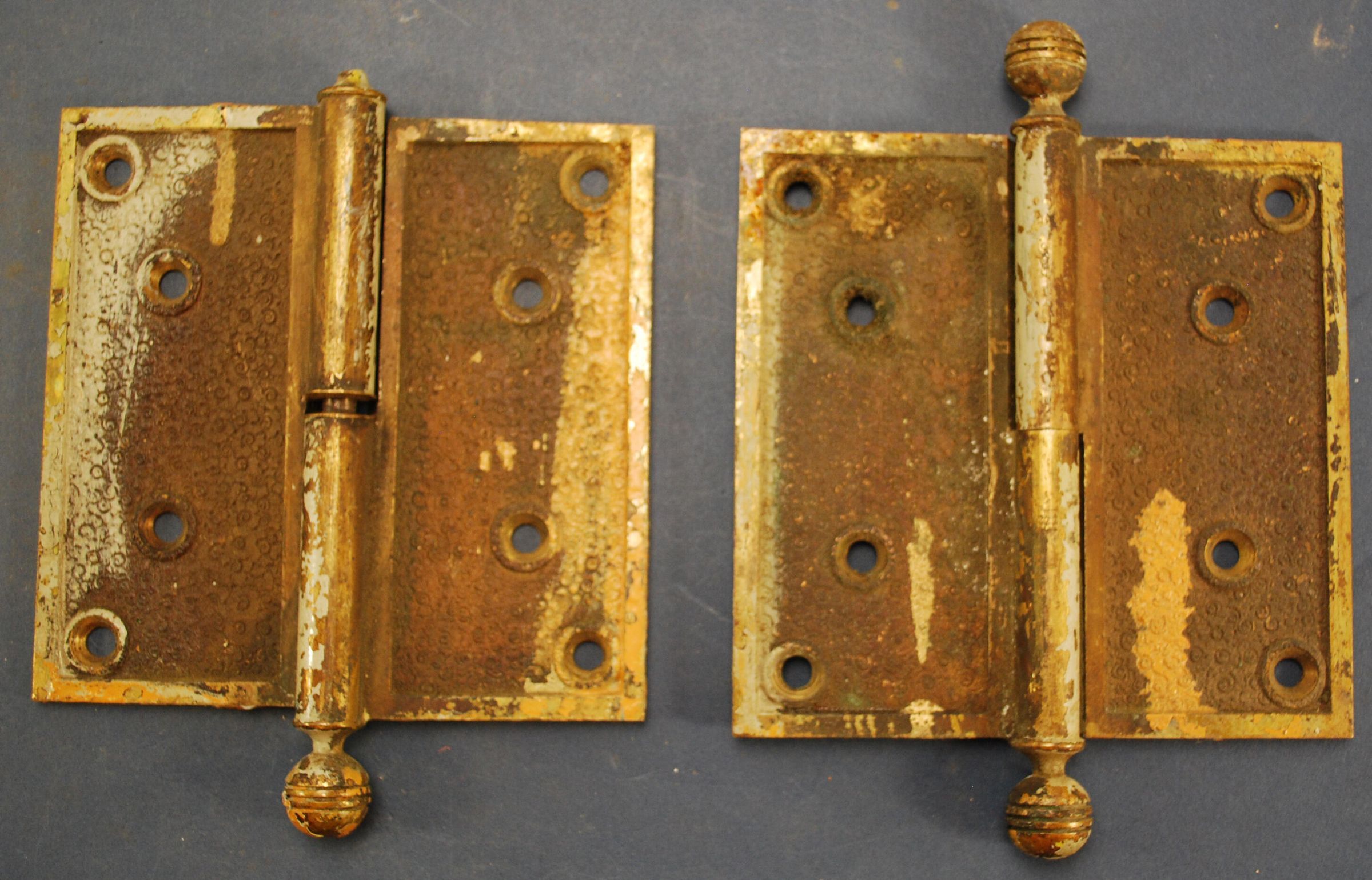 Design Name: Damascene Manufacturer: Russell & Erwin Mfg. Co. Style: Persian Material: Bronze Manufacturing Method: Cast Surface Finish: Aged / Unpolished VDA Classification: VDA Number: Shape: Patent Specifics: Lock Type (If Applicable): Inscription/Makers Mark: Inscription Text: Comments: .Two Complete Hinges. One Finial is Missing. Loose Joint Hinge. No 52. 5 x 5. R.