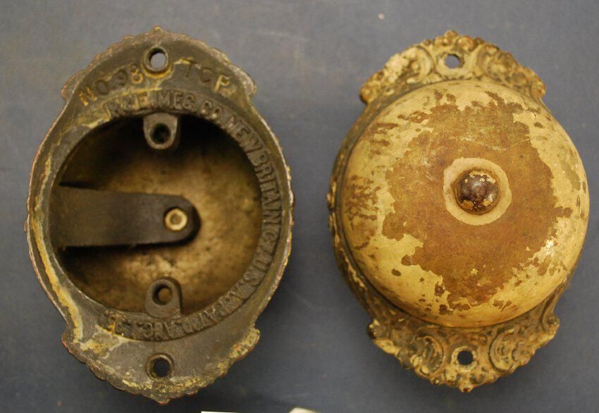 Design Name: Manufacturer: Russell & Erwin Mfg. Co. Style: Aesthetic Material: Iron / Steel / Brass Manufacturing Method: Cast / Stamped Surface Finish: Aged / Unpolished / Painted VDA Classification: VDA Number: Shape: Patent Specifics: Lock Type (If Applicable): Inscription/Makers Mark: Inscription Text: No. 98. Top. R & E Mfg. Co. New Britain CT. U>S>A> Pat'd Aug. 1, 93. Comments: .One with Brass Bell. Missing Mechanism. Other has Steel Bell. Twist type.