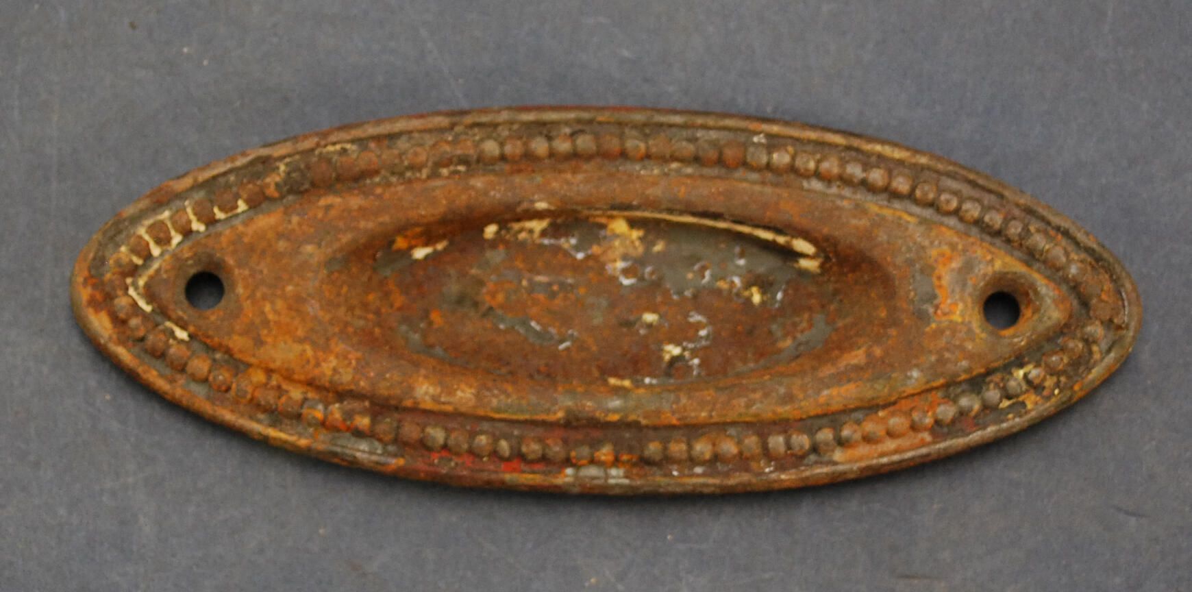 Design Name: Wayne Manufacturer: Russell & Erwin Mfg. Co. Style: Colonial Revival Material: Steel Manufacturing Method: Wrought / Stamped Surface Finish: Antique Copper VDA Classification: VDA Number: Shape: Patent Specifics: Lock Type (If Applicable): Inscription/Makers Mark: Inscription Text: Comments: Flush, appears burnt.