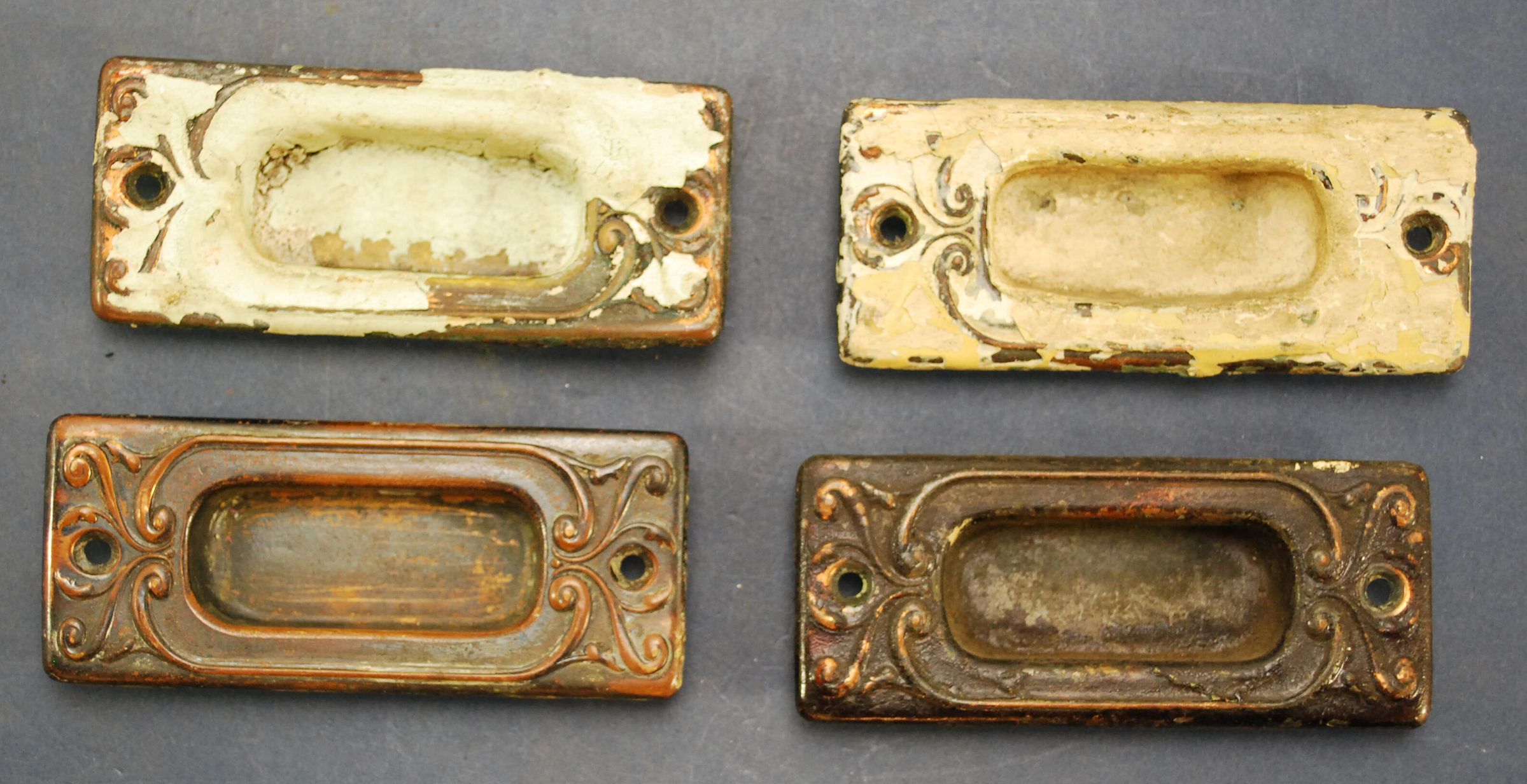 Design Name: Clermont Manufacturer: Russell & Erwin Mfg. Co. Style: Material: Bronze or Brass Manufacturing Method: Wrought / Stamped Surface Finish: Plated, Antique Copper VDA Classification: VDA Number: Shape: Patent Specifics: Lock Type (If Applicable): Inscription/Makers Mark: Inscription Text: Comments: One bent on corner, two are painted, flush type.