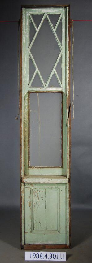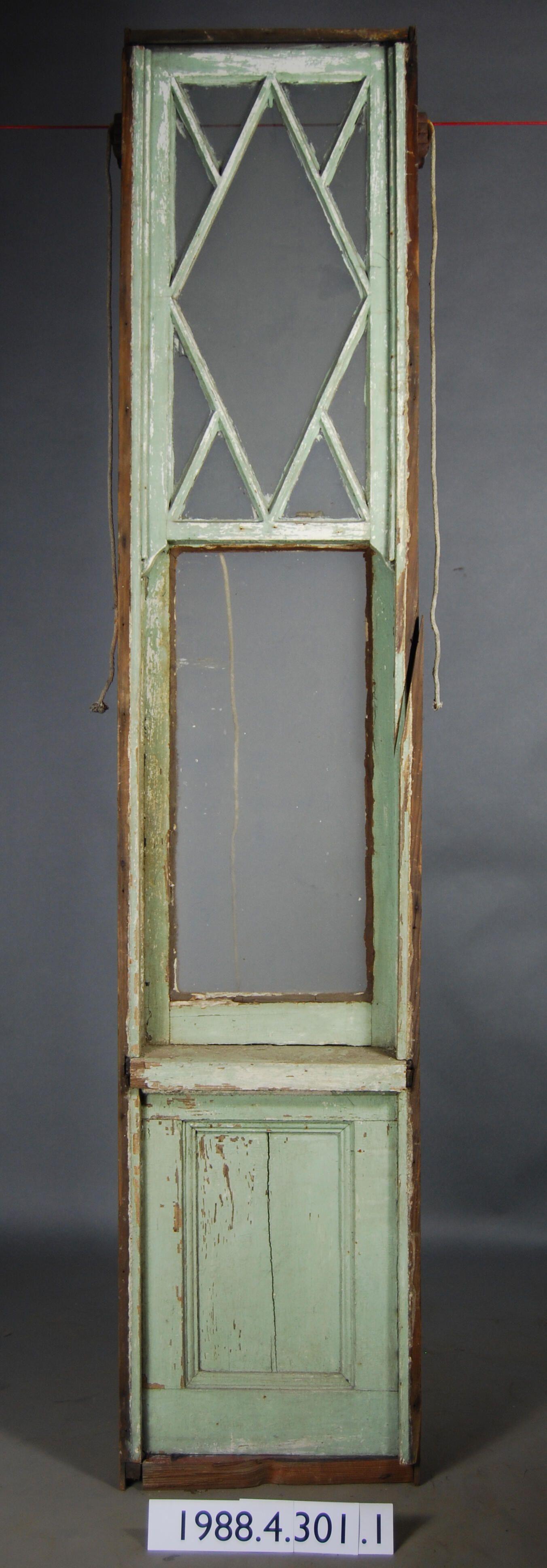 Rectangular. Frame. Top sash is segmented. Has nine openings with one diamond shaped and eight triangular complete clear colorless glass panes. Has iron latch hardware. Ogee lugs. Bottom sash is single opening with complete clear glass pane. Has iron tab lift handle. Bottom of frame assembly has one panel. Recessed on interior and exterior. Upper frame has four iron sash weight pulleys.