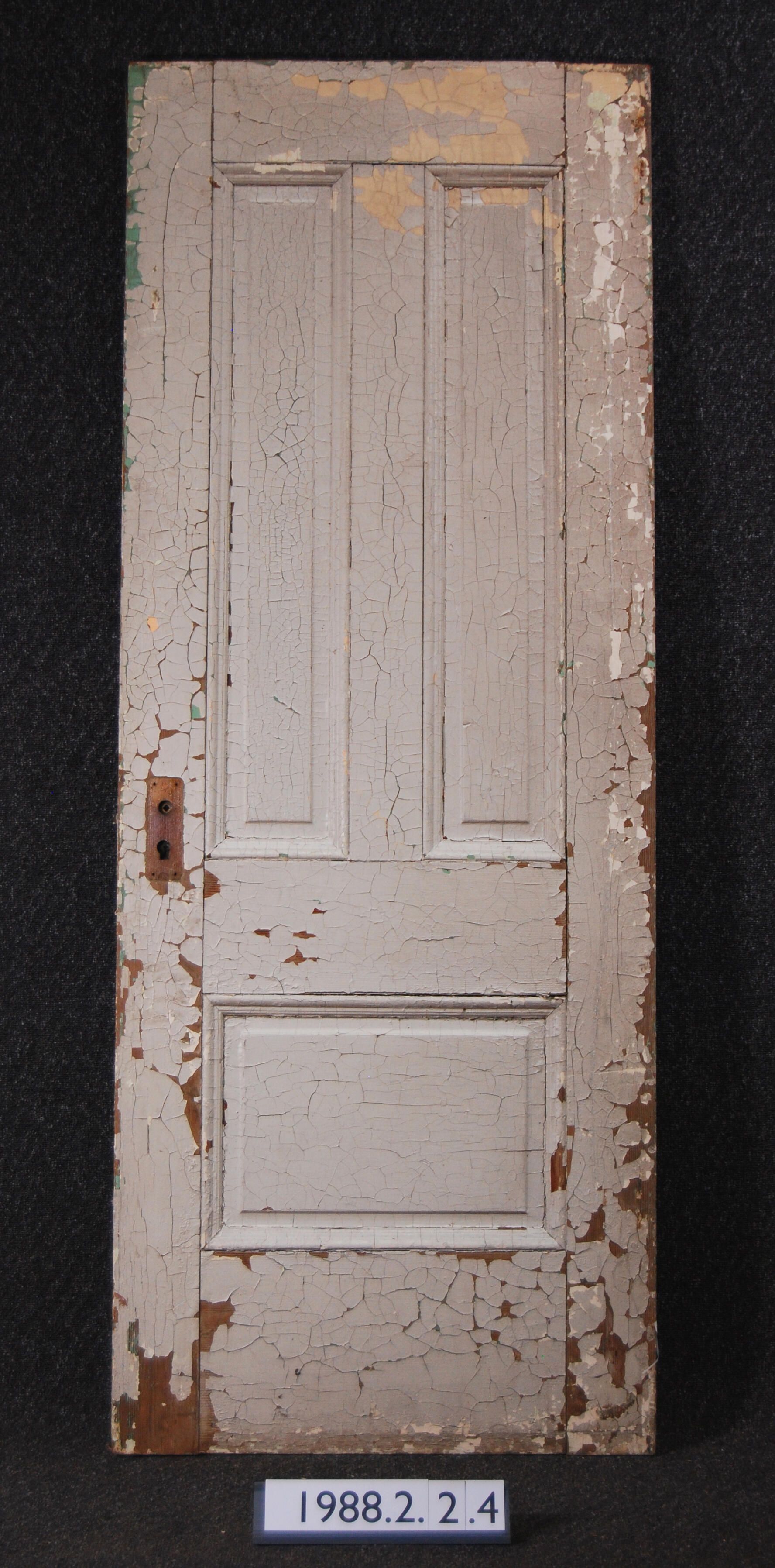Rectangular. Mortice and tenon and coped joints. Single opening with complete clear colorless beveled glass pane. Has two iron butt hinges. Latch is missing.