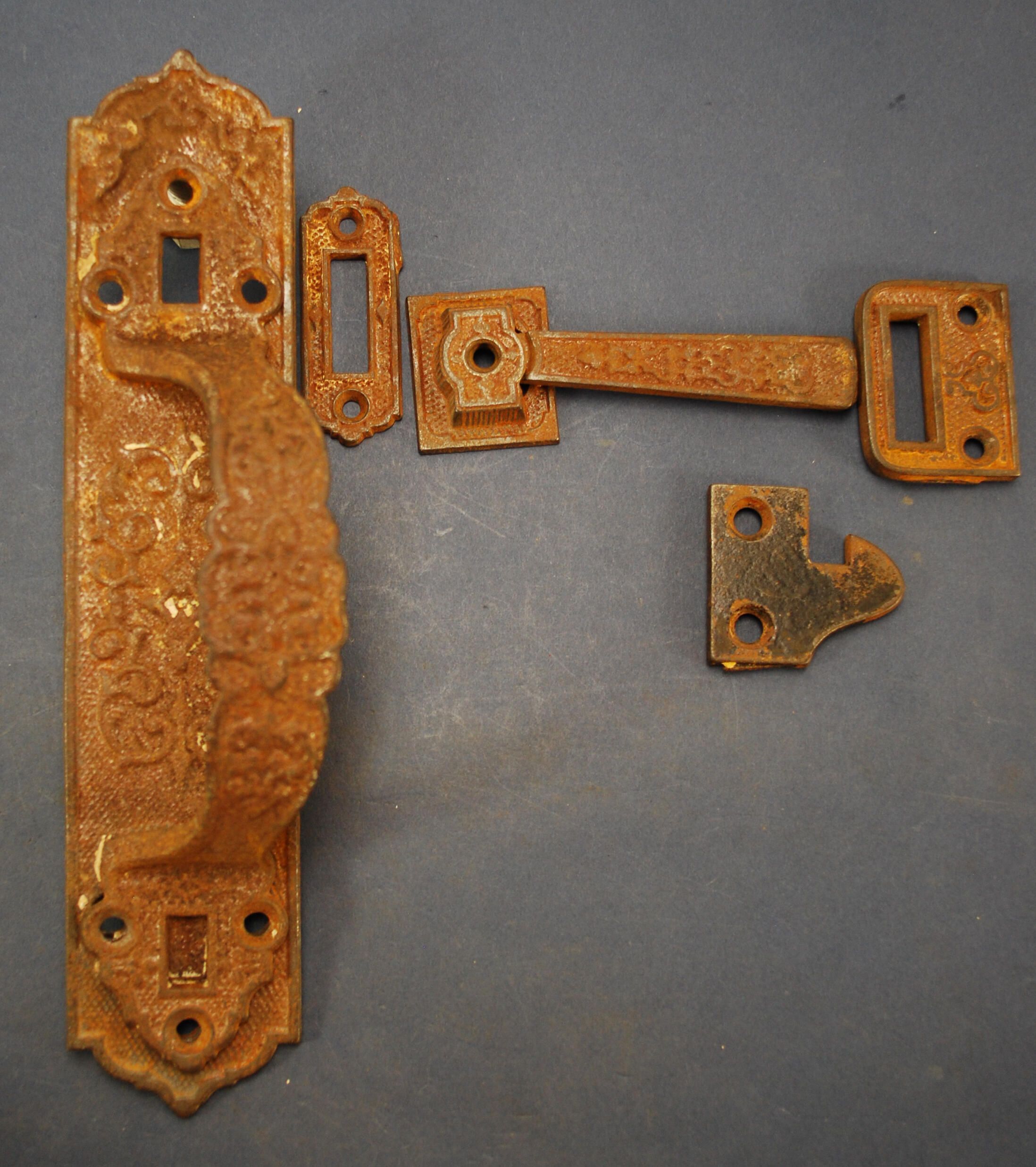 Comments: Thumber is missing, includes handle, escutcheon, latchbar keeper, and catch.
