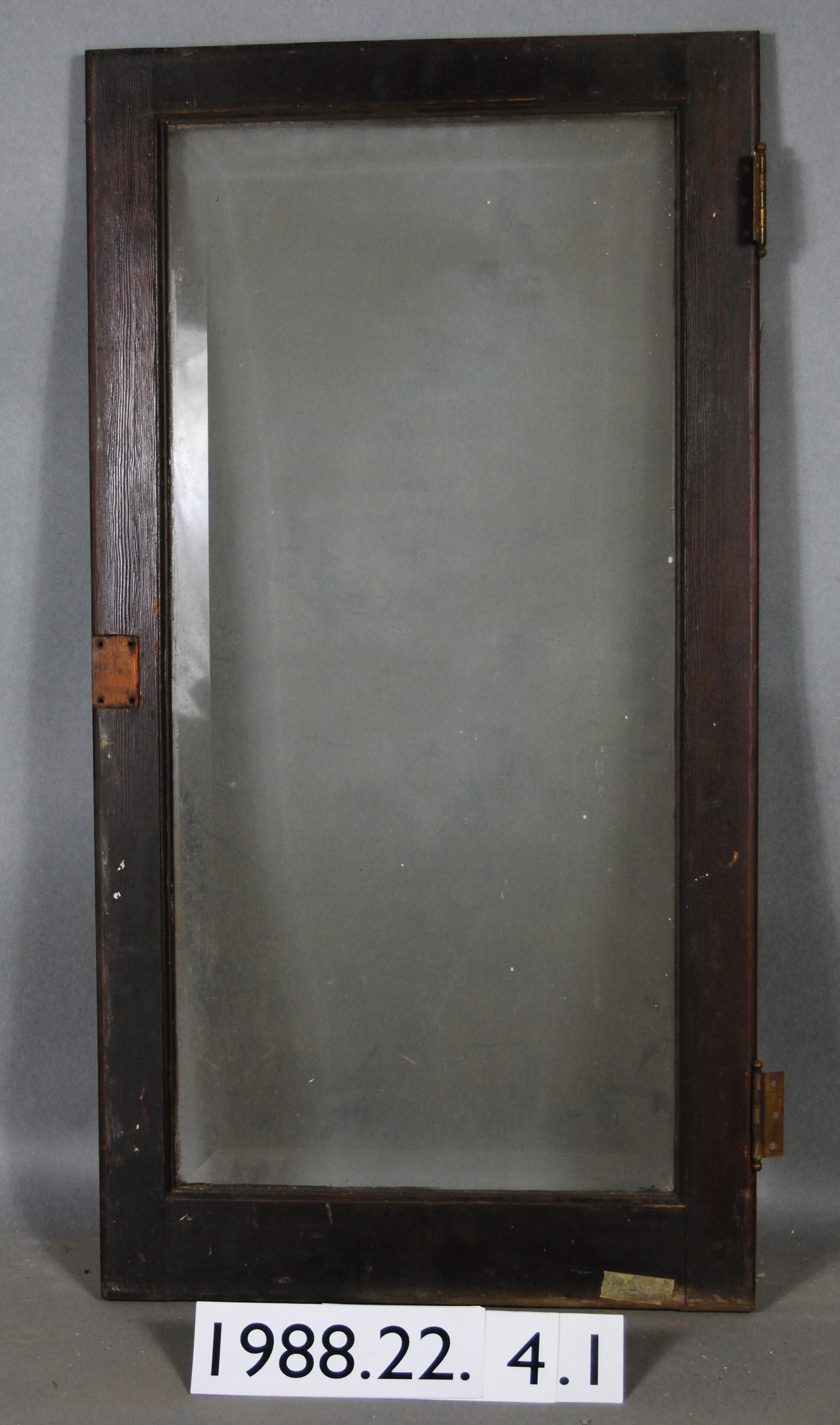 Rectangular. Mortice and tenon and coped joints. Single opening with complete clear colorless beveled glass pane. Has two iron butt hinges. Latch is missing.
