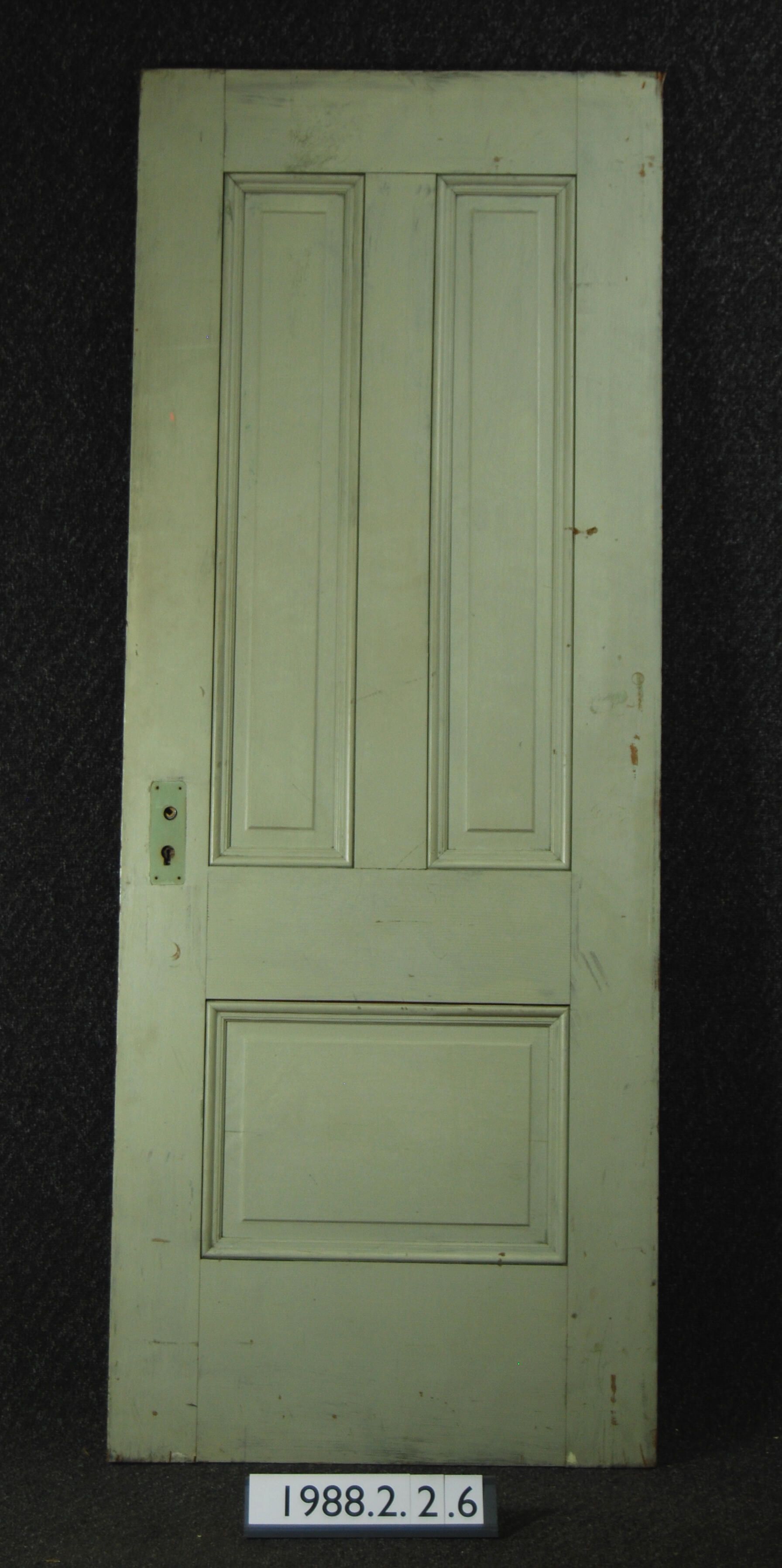 Rectangular. Mortice and tenon and coped joints. Single opening. Missing glass pane. Has two incomplete iron butt hinges. Solid brass spring latch.