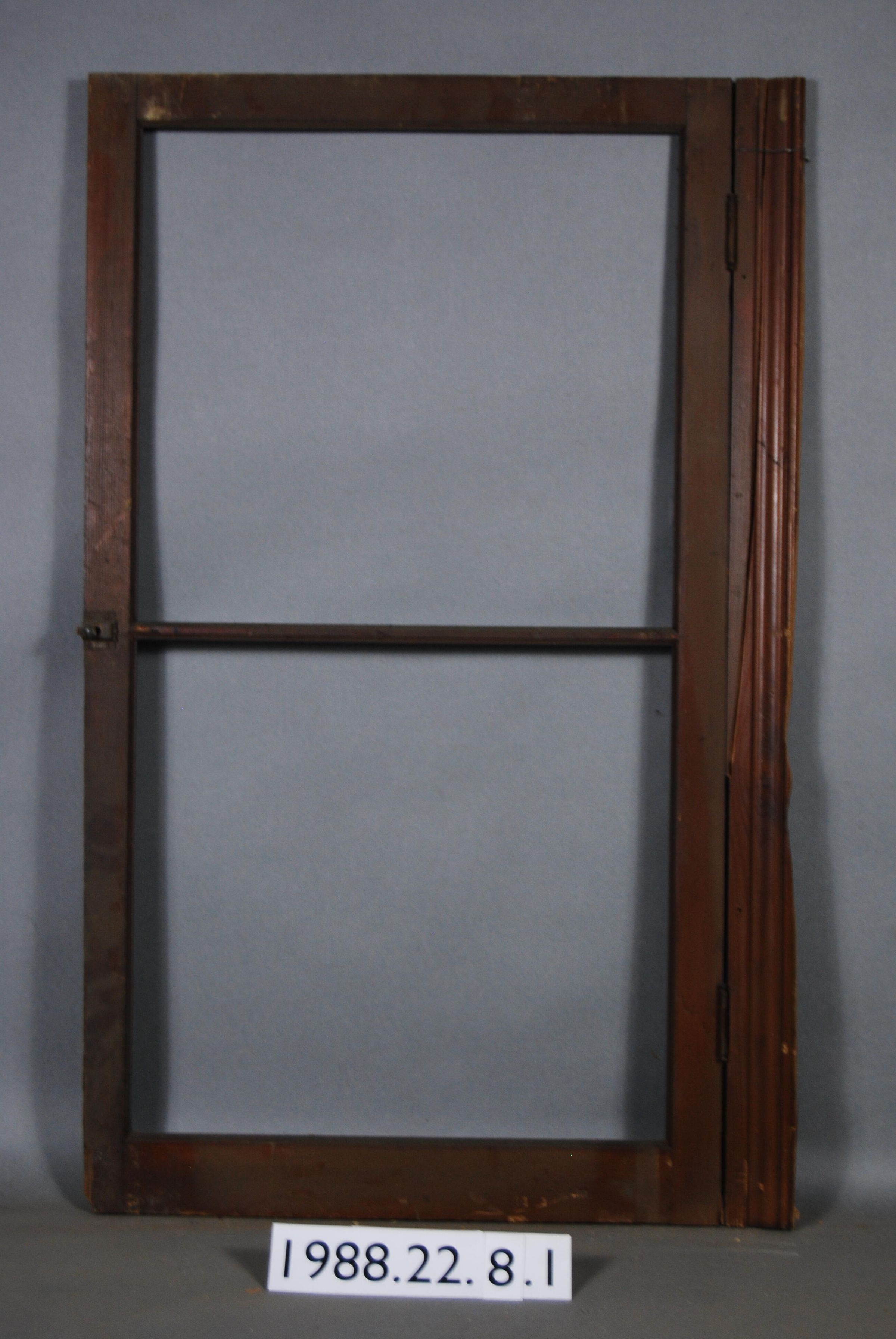 Rectangular. Mortice and tenon and coped joints. Two openings divided by horizontal muntin. Both top and bottom glass panes are missing. Has two complete iron butt hinges and attached piece of cabinet frame / molding.