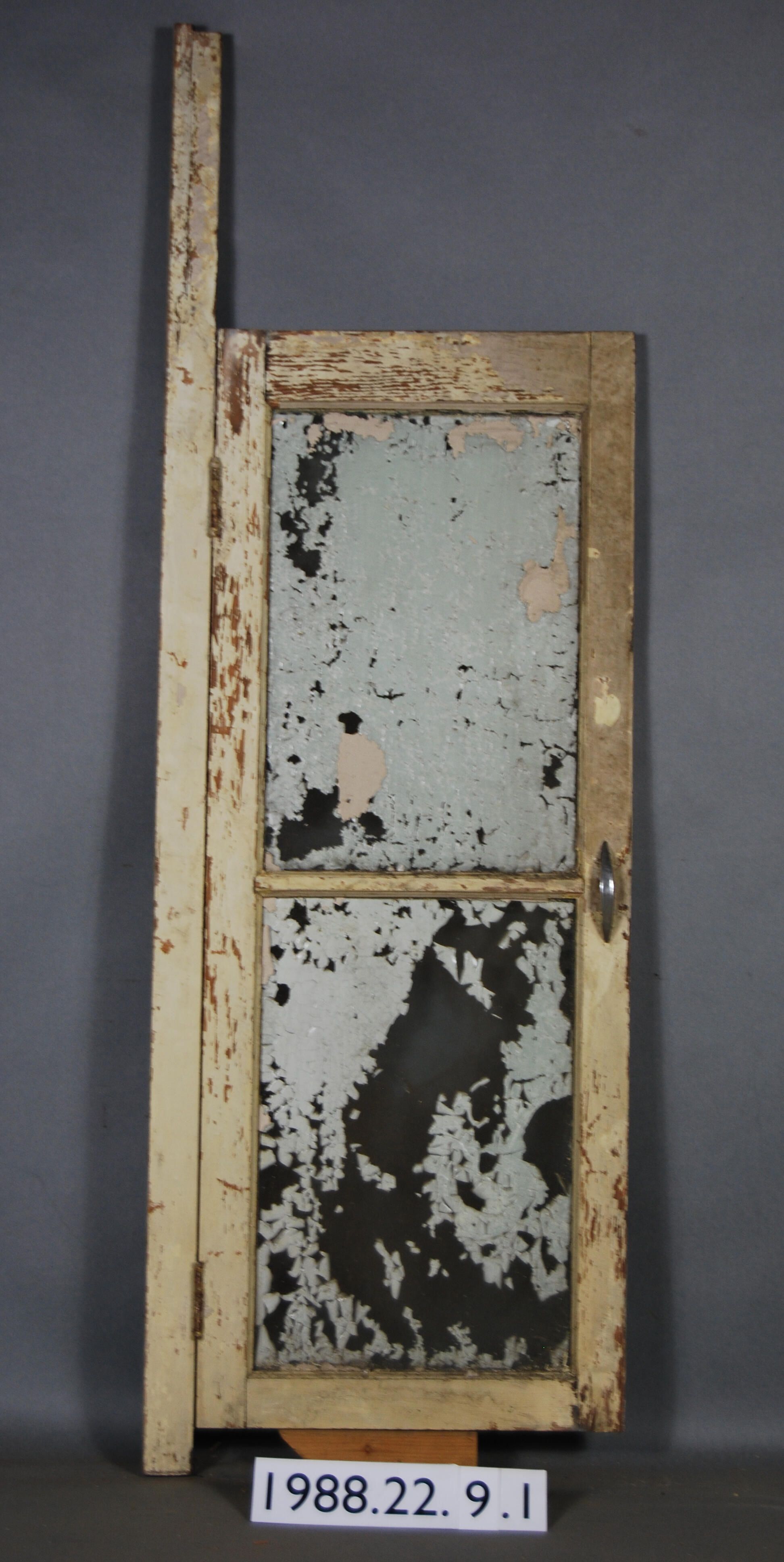 Rectangular. Two openings divided by horizontal muntin. Both with complete clear colorless glass panes. Glass has been painted. Has two complete butt hinges. Attached piece of cabinet frame. Modern chrome plated handle.