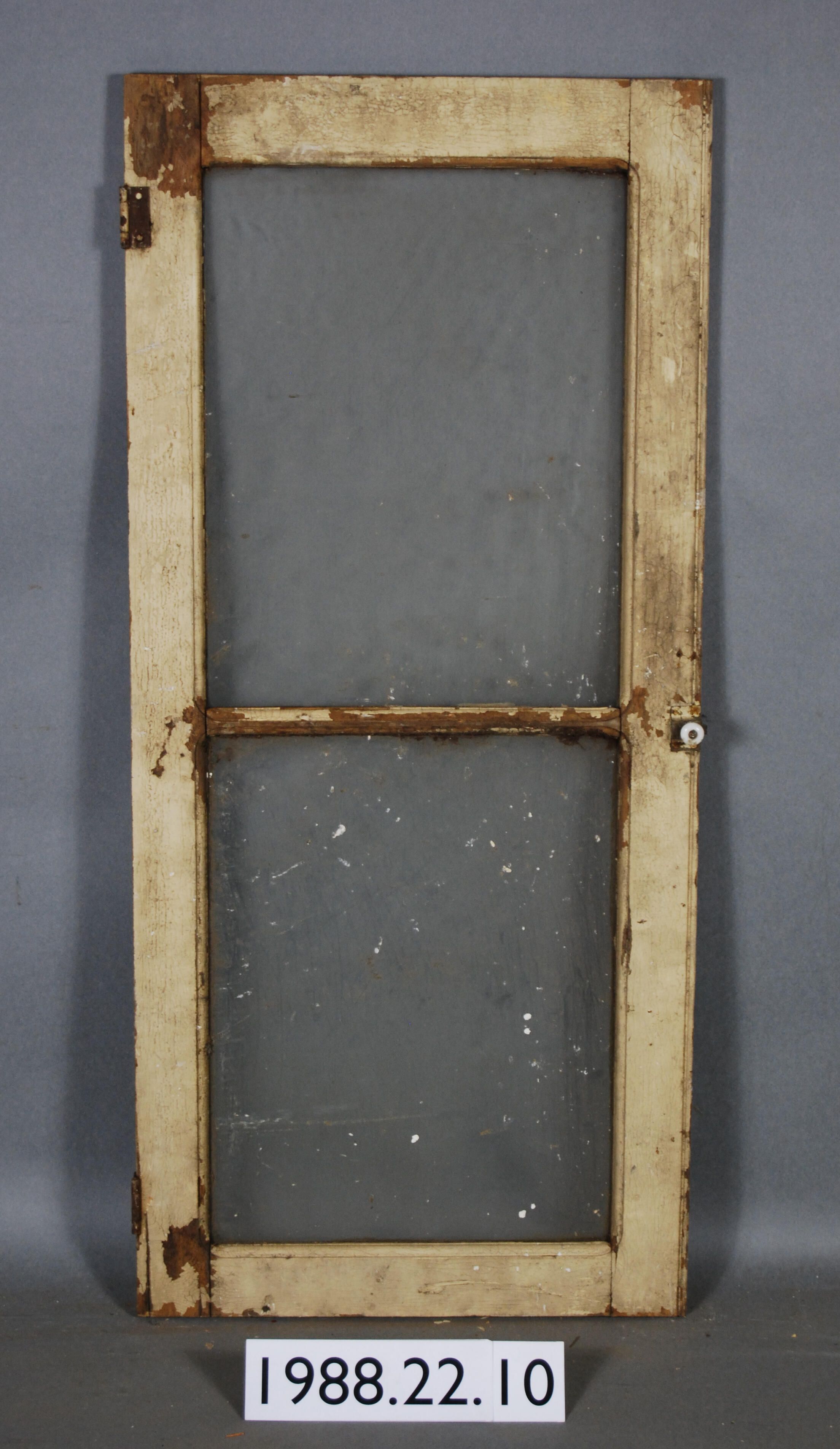 Rectangular. Two openings divided by horizontal muntin. Both with complete clear colorless glass panes. Has two complete iron butt hinges. Has brass spring latch with white porcelain knob.