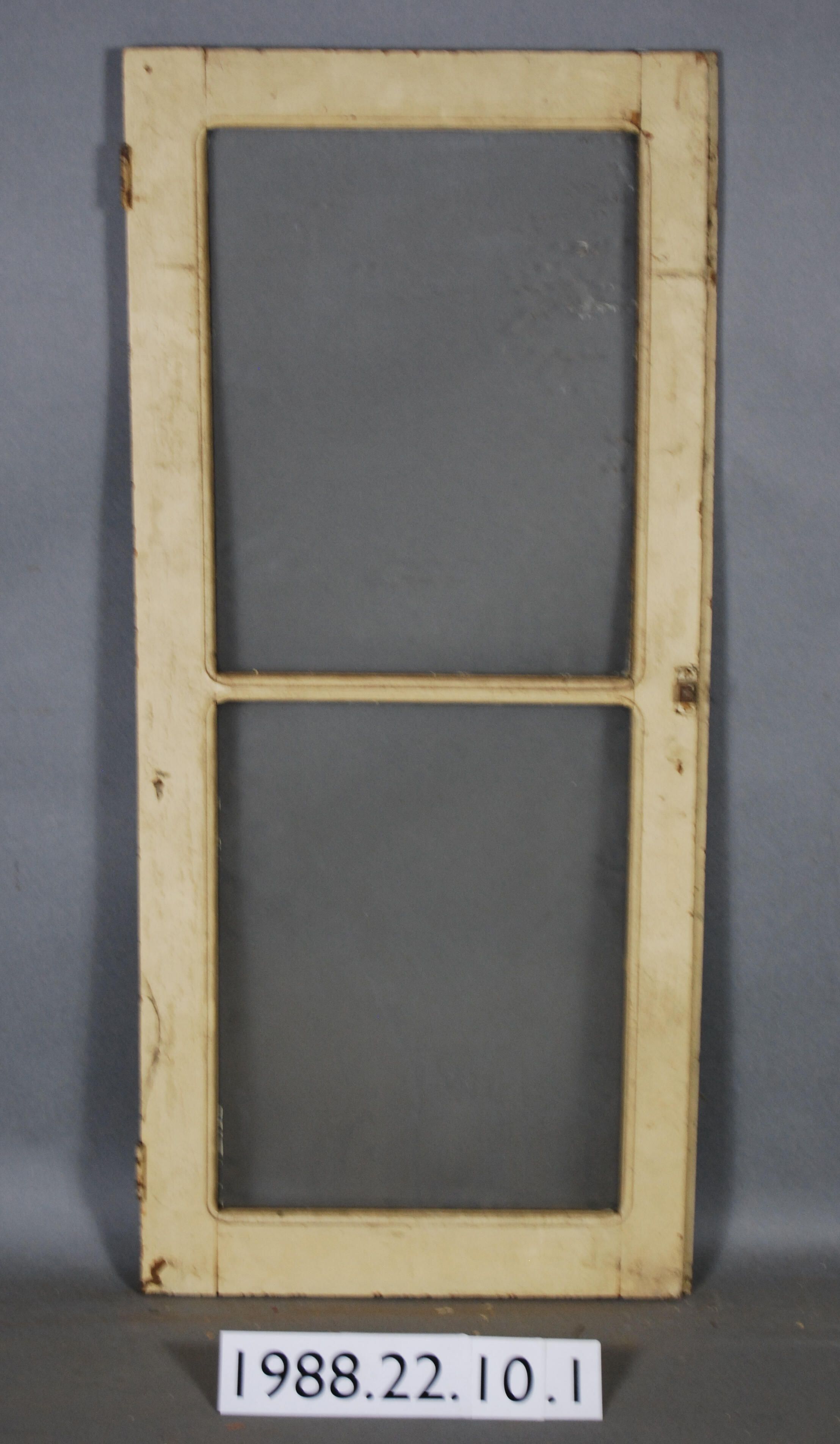 Rectangular. Two openings divided by horizontal muntin. Both with complete clear colorless glass panes. Has two complete iron butt hinges. Has brass latch strike.