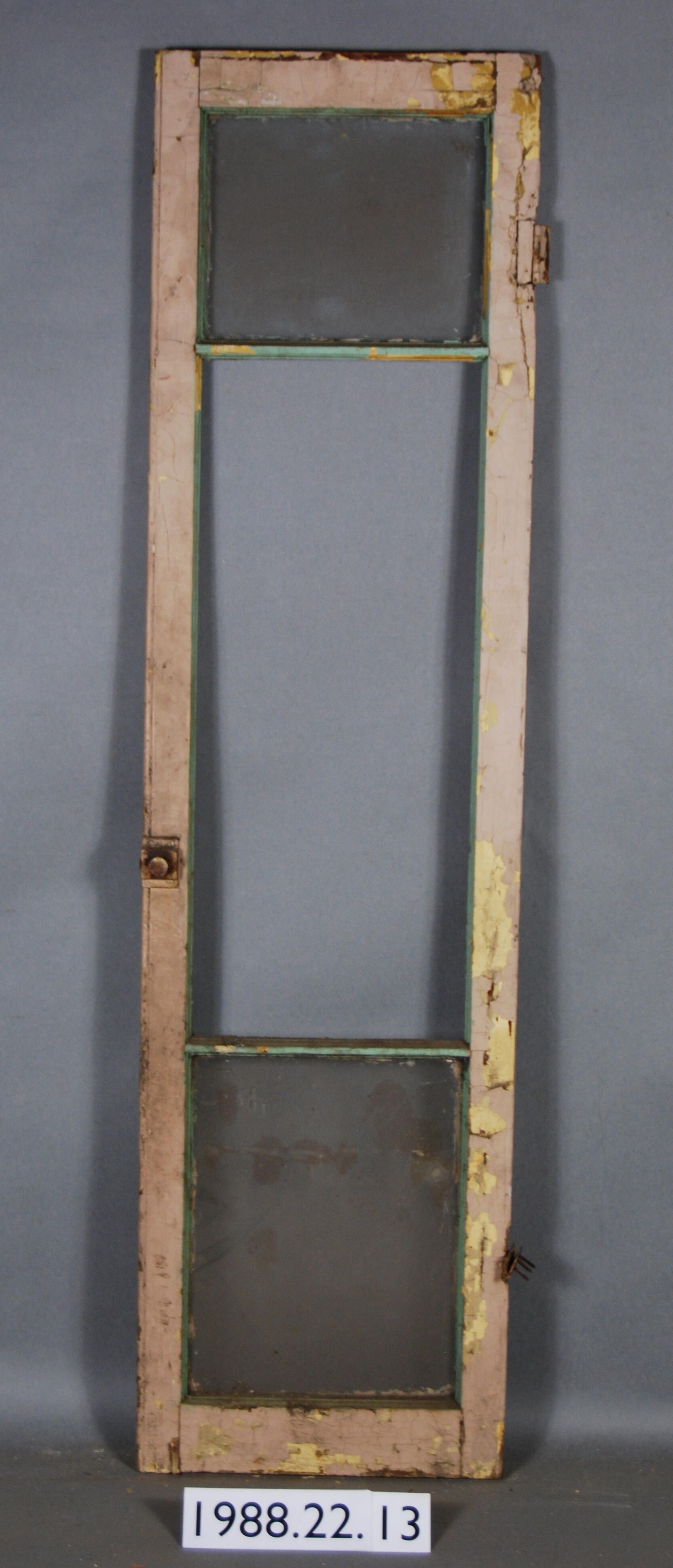 Rectangular. Two openings divided by horizontal muntin. Top glass pane is complete. Bottom pane is broken. Both hinges are missing. Has iron spring latch.