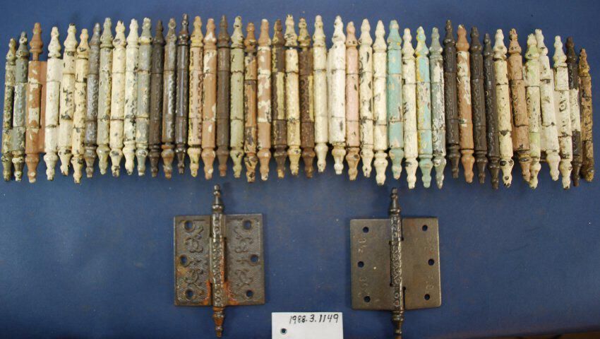 Design Name: Manufacturer: Sargent & Co. Style: Neo-grec Material: Iron Manufacturing Method: Cast Surface Finish: Aged, unpolished, painted VDA Classification: VDA Number: Shape: Patent Specifics: Lock Type (If Applicable): Inscription/Makers Mark: Inscription Text: Comments: 3 1/2 x 3 1/2 butt hinge, some stripped, some painted with multiple layers.