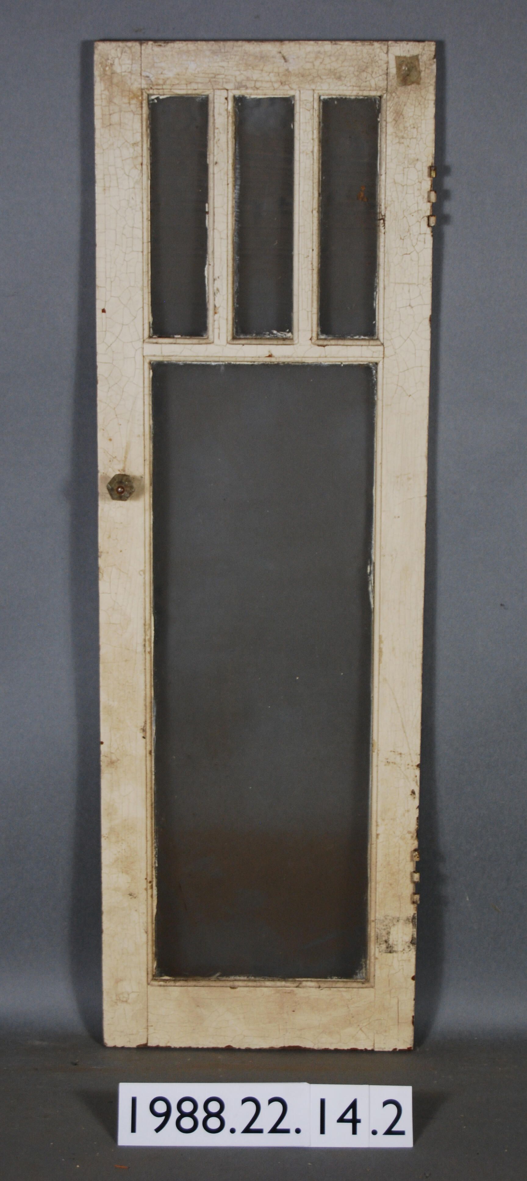 Rectangular. Segmented four openings divided by muntins (three over one). All with complete glass panes. Two incomplete butt hinges. Has faceted glass knob.