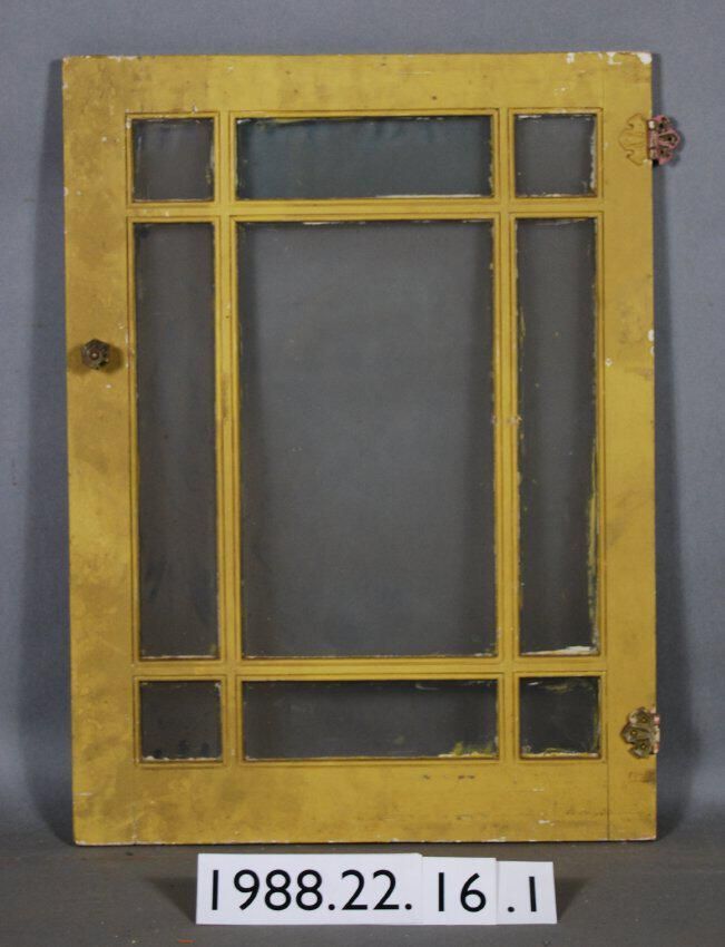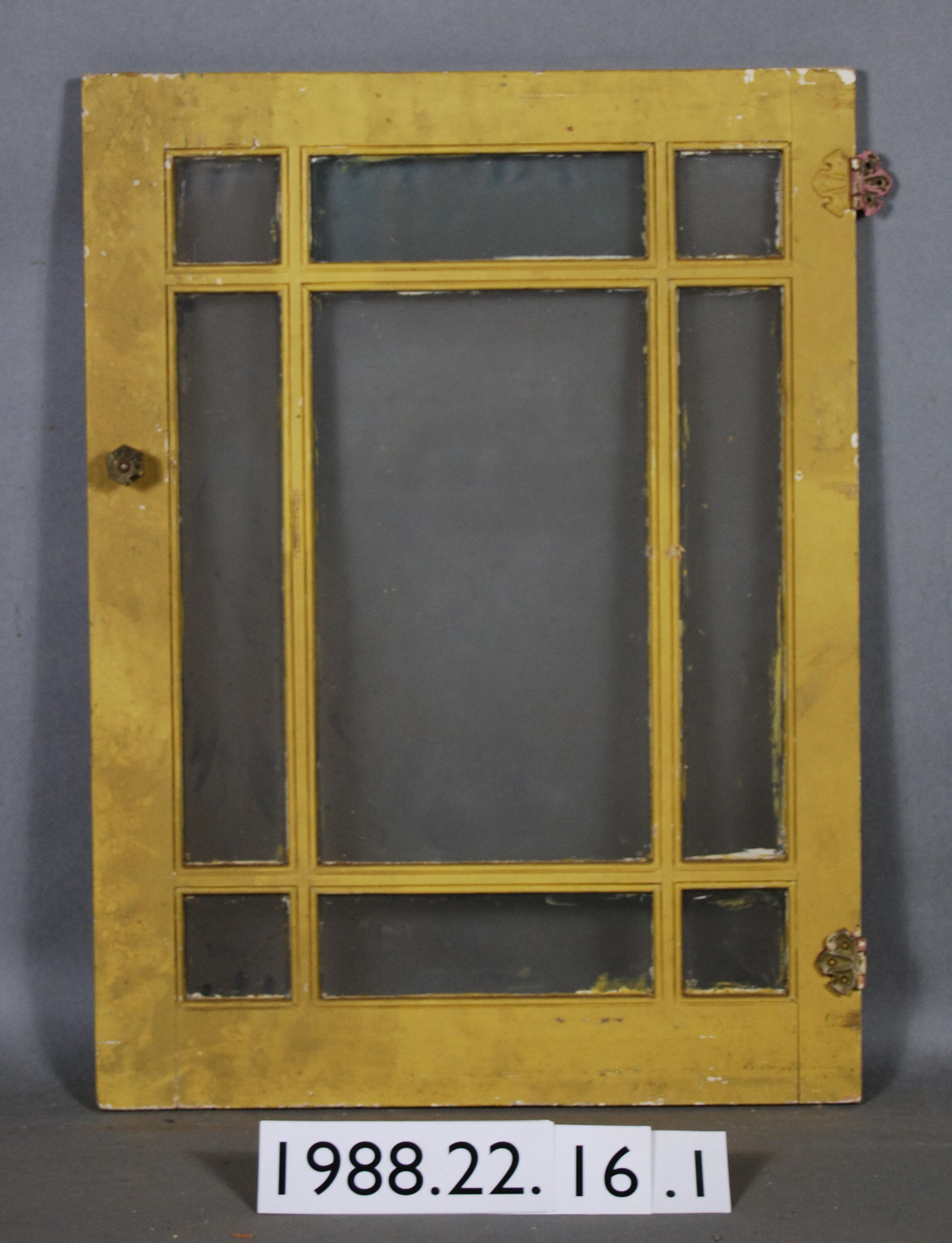 Rectangular. Segmented nine openings divided by muntins. All with complete glass panes. Butterfly hinges mounted on front edge. Has faceted glass knob.