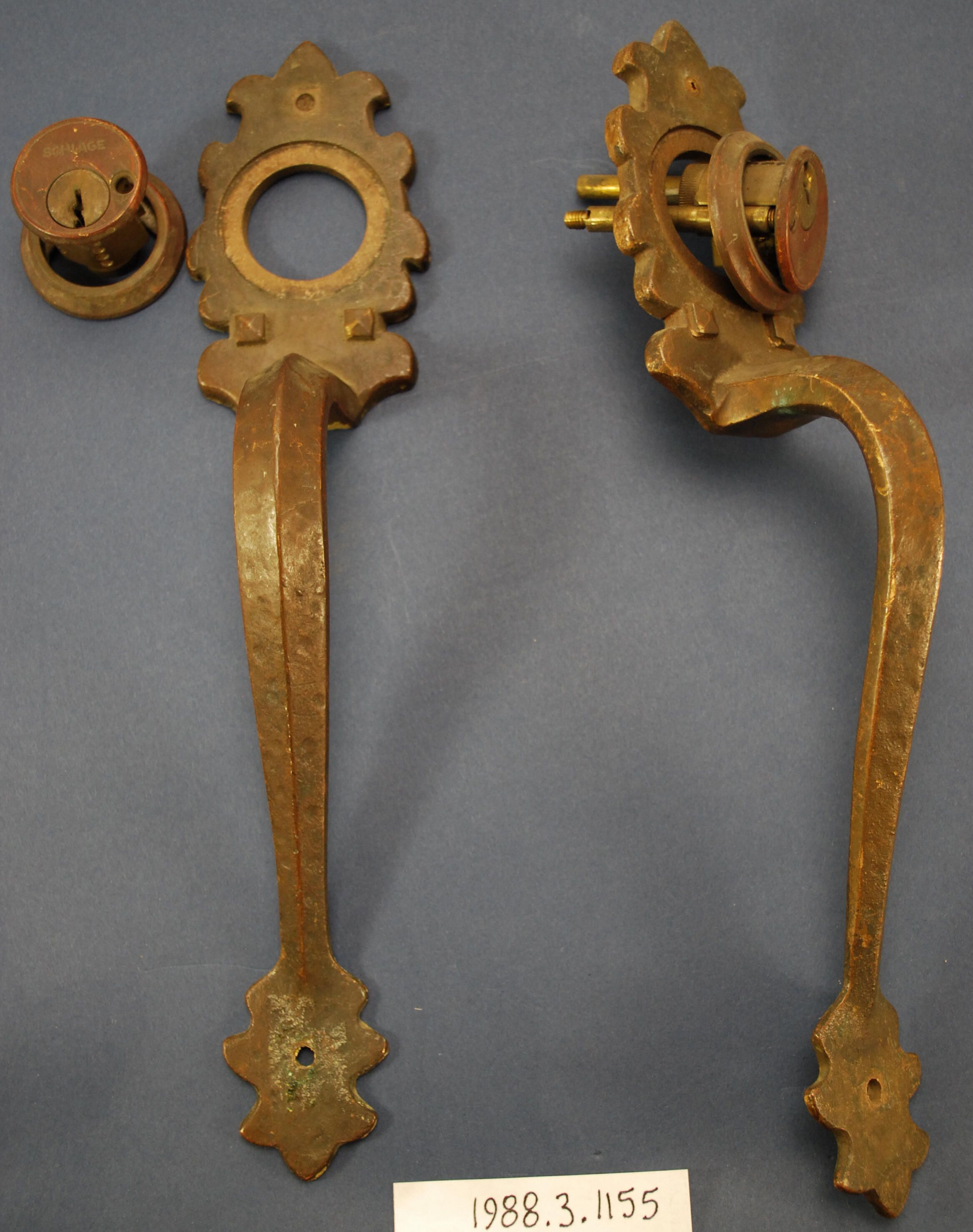 Design Name: Manufacturer: Schlage Lock Co. Style: Romance Revival Material: Bronze Manufacturing Method: Cast Surface Finish: Aged, unpolished VDA Classification: VDA Number: Shape: Patent Specifics: Lock Type (If Applicable): Inscription/Makers Mark: Schlage Inscription Text: Comments: Pair of Schlage cylinder locks.