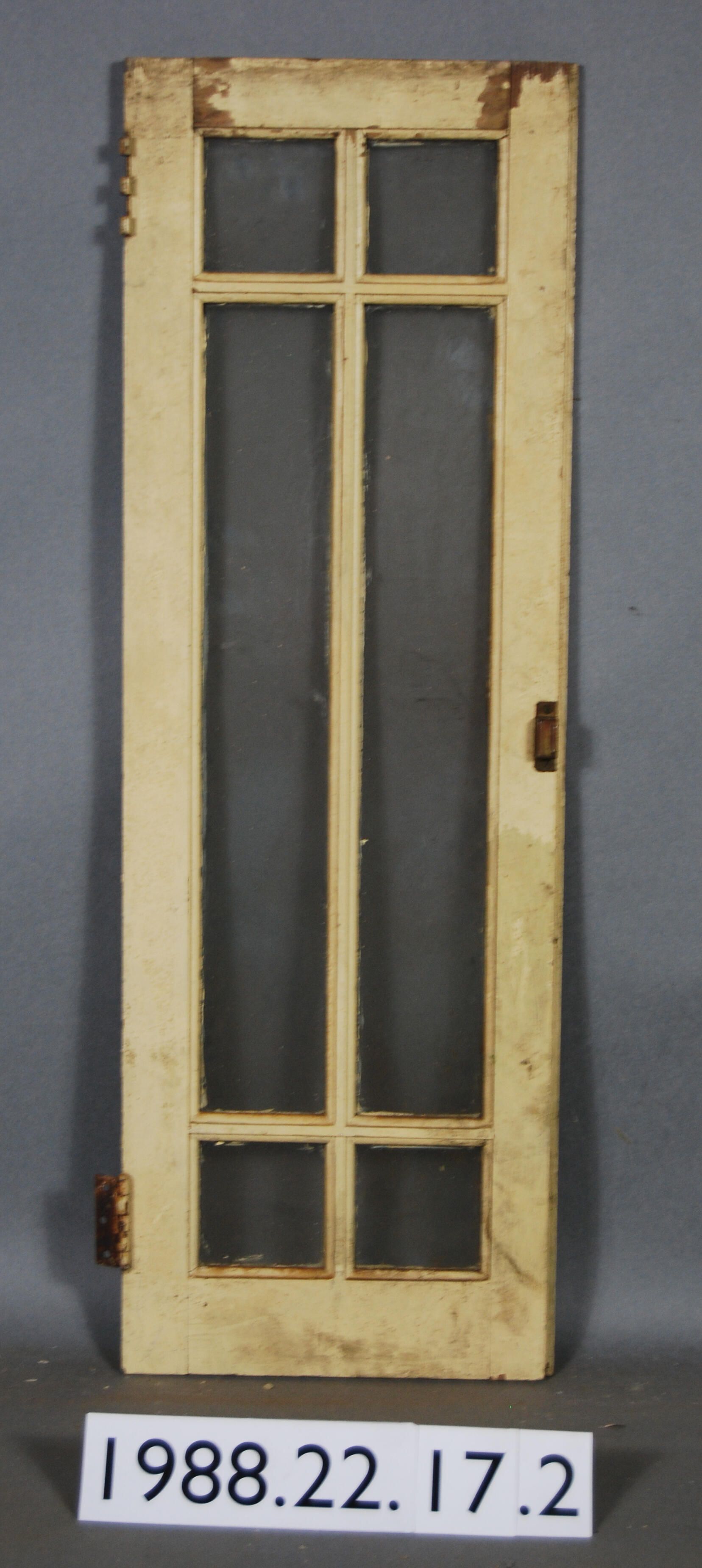 Rectangular. Segmented six openings divided by muntins. All with complete glass panes. One complete butt hinge and one incomplete hinge. Has brass latch strike. Reverse has spring loaded latch.