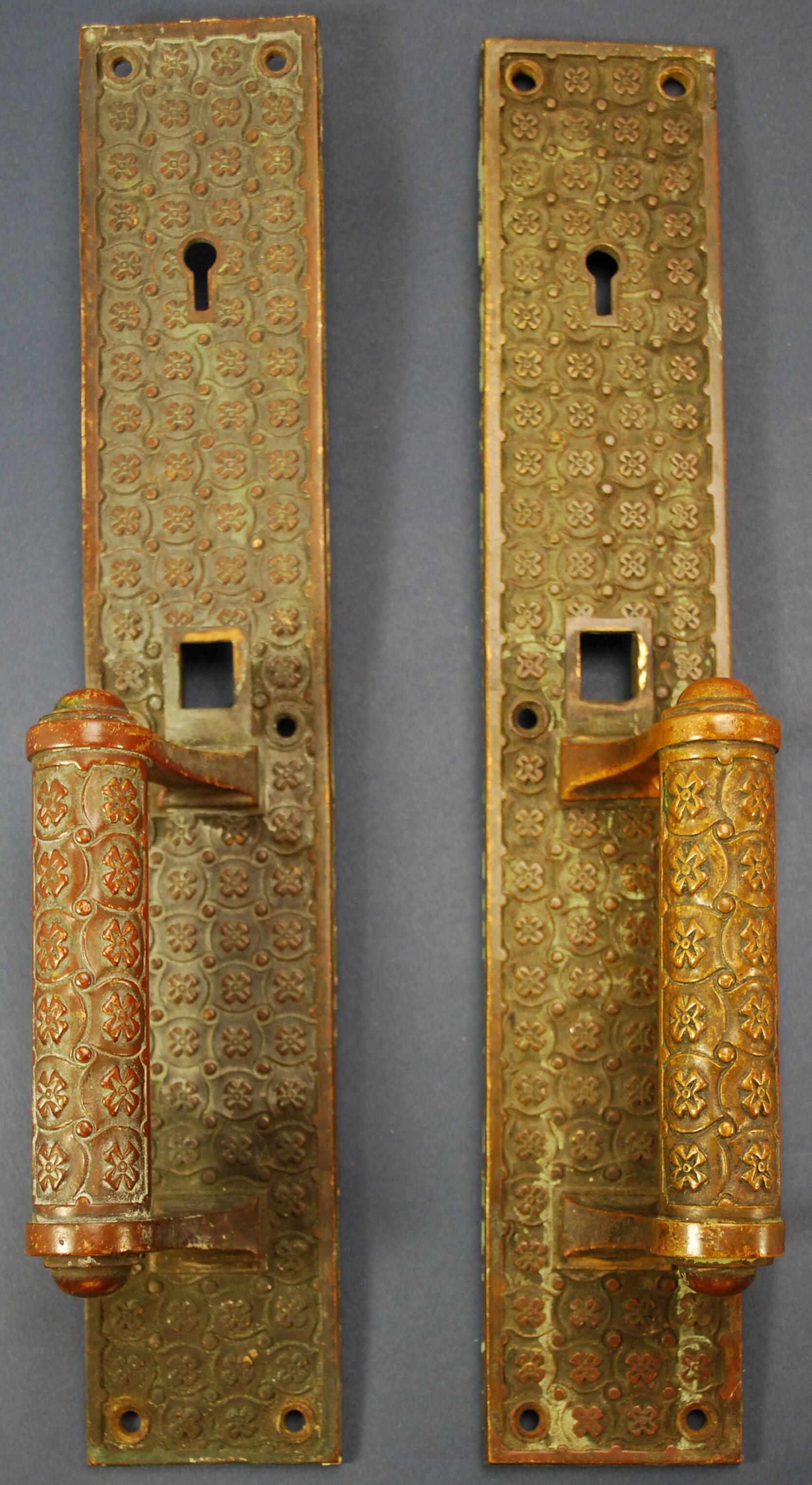 Design Name: Madras Manufacturer: Yale & Towne Mfg. Co. Style: East Indian Material: Bronze Manufacturing Method: Cast Surface Finish: Aged, Unpolished VDA Classification: VDA Number: Shape: Patent Specifics: Lock Type (If Applicable): Inscription/Makers Mark: Yale & Towne Inscription Text: 7 89; 9614 Comments: Thumber is missing, has keyhole, one is bent, matched pair.