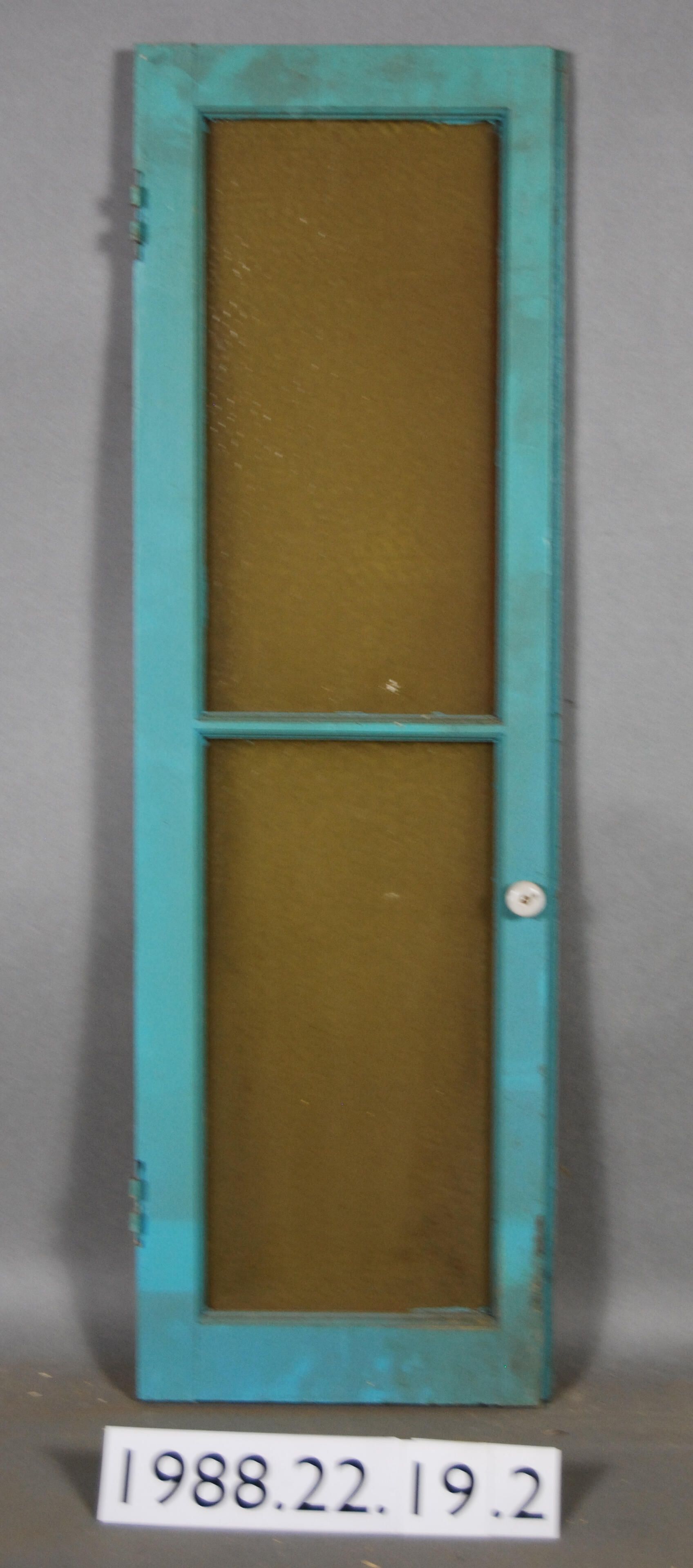 Rectangular. Segmented two openings divided by horizontal muntin. Has two complete amber colored glass panes, which were probably later replacements. Has two incomplete iron butt hinges. Has one white porcelain knob.