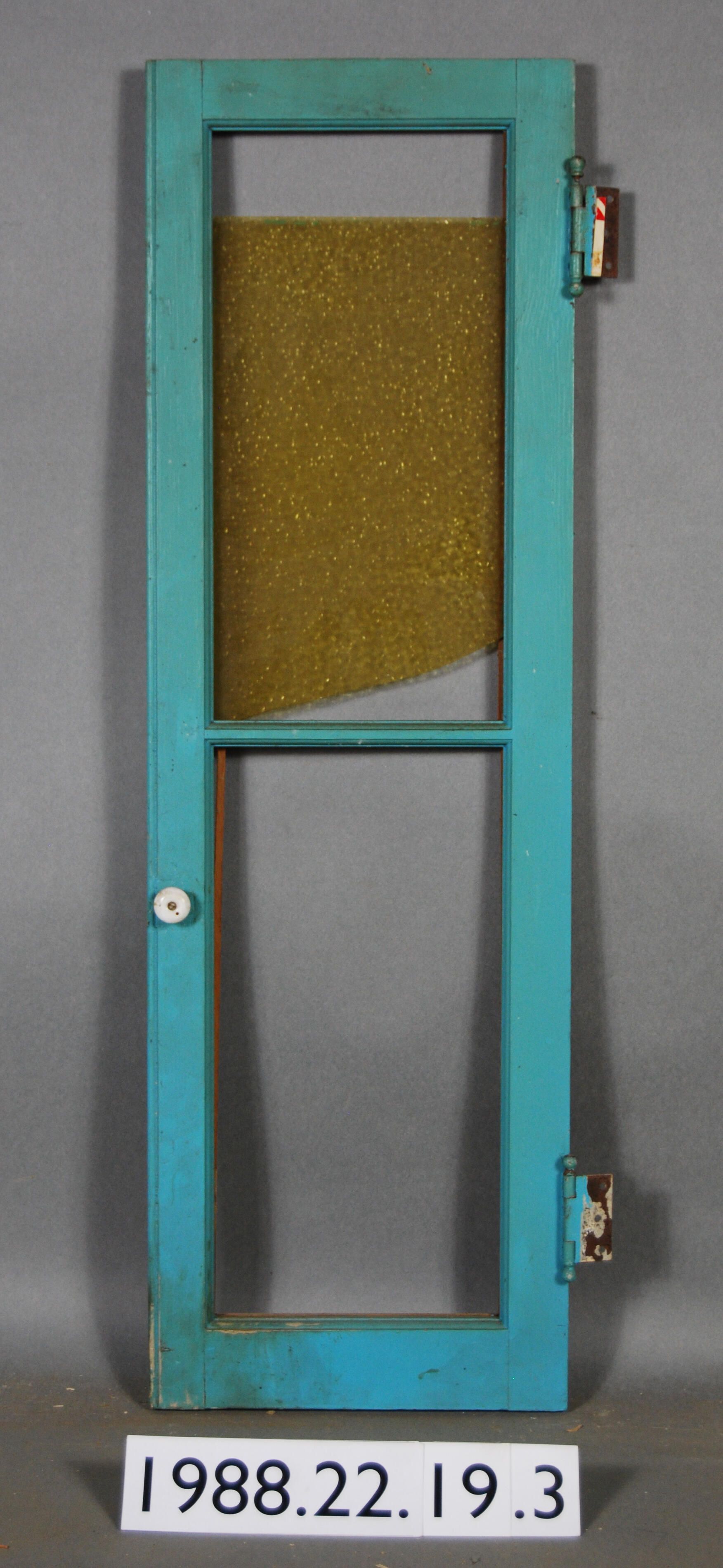 Rectangular. Segmented two openings divided by horizontal muntin. Has one broken amber colored glass pane which was probably later replacement. Other pane is missing. Has two complete iron butt hinges. One white porcelain knob.