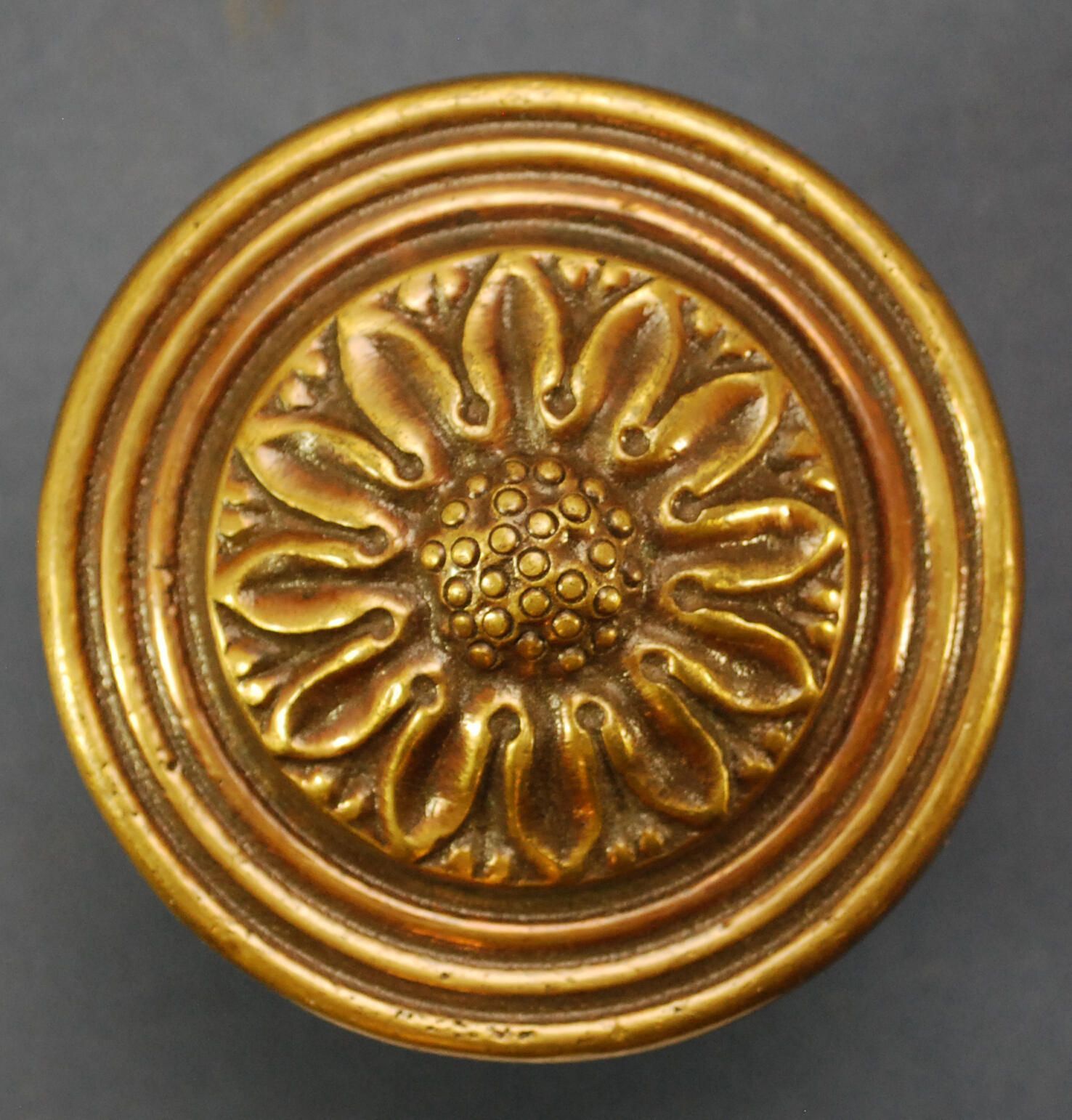 Design Name: Manufacturer: unknown Style: Material: Bronze Manufacturing Method: Wrought, Stamped Surface Finish: VDA Classification: Representational VDA Number: Shape: Domed Patent Specifics: Lock Type (If Applicable): Inscription/Makers Mark: Inscription Text: Comments: Foreign made, floral motif.