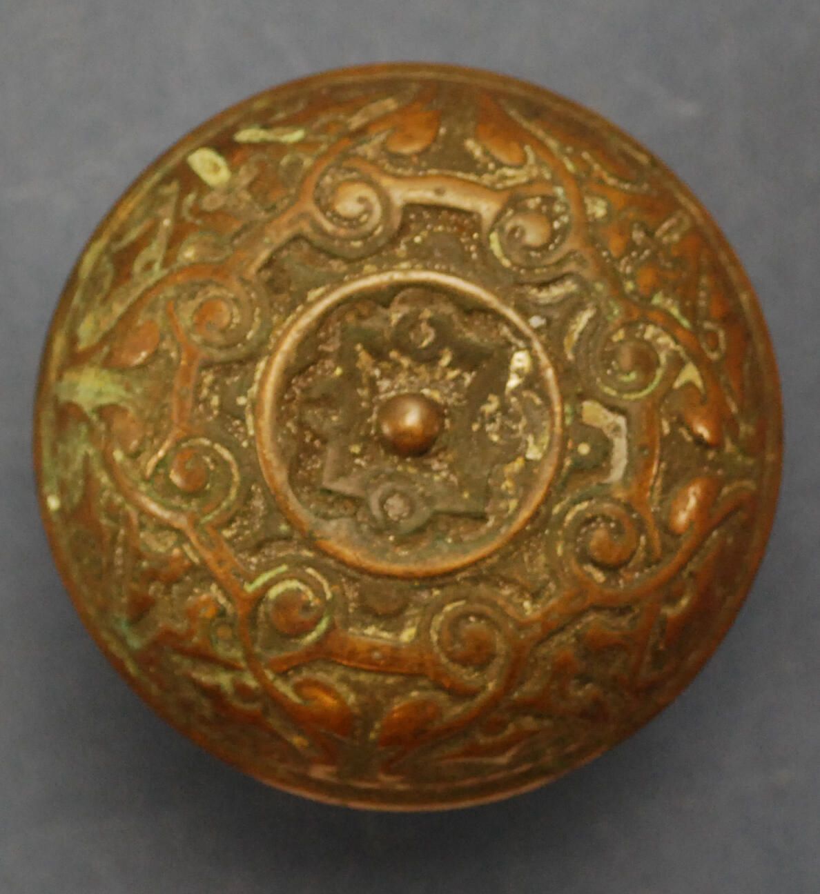 Design Name: Manufacturer: unknown Style: Neo-Grec Material: Bronze Manufacturing Method: Cast Surface Finish: Aged, unpolished VDA Classification: Fourfold Symmetry VDA Number: H-107 Shape: Domed Patent Specifics: Lock Type (If Applicable): Inscription/Makers Mark: Inscription Text: Comments: Sixfold version with same center design also made, good to poor condition.