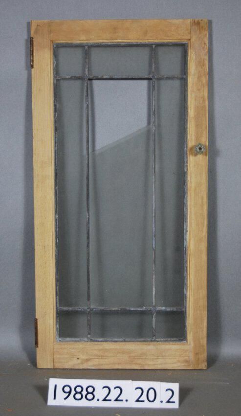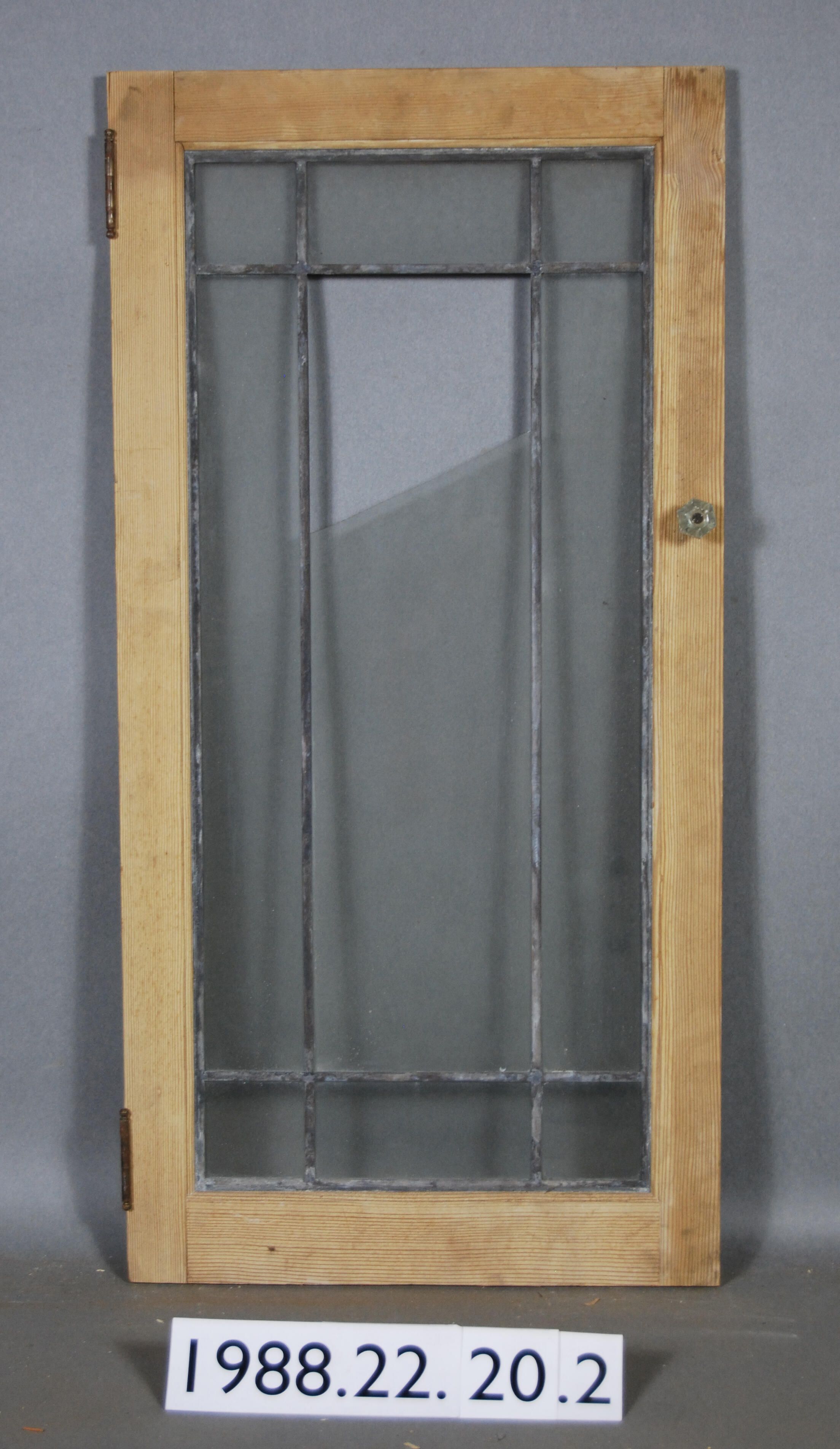 Rectangular. Segmented nine openings divided by zinc cames. Eight complete glass panes. One broken pane. Has two complete iron butt hinges. One faceted glass knob..