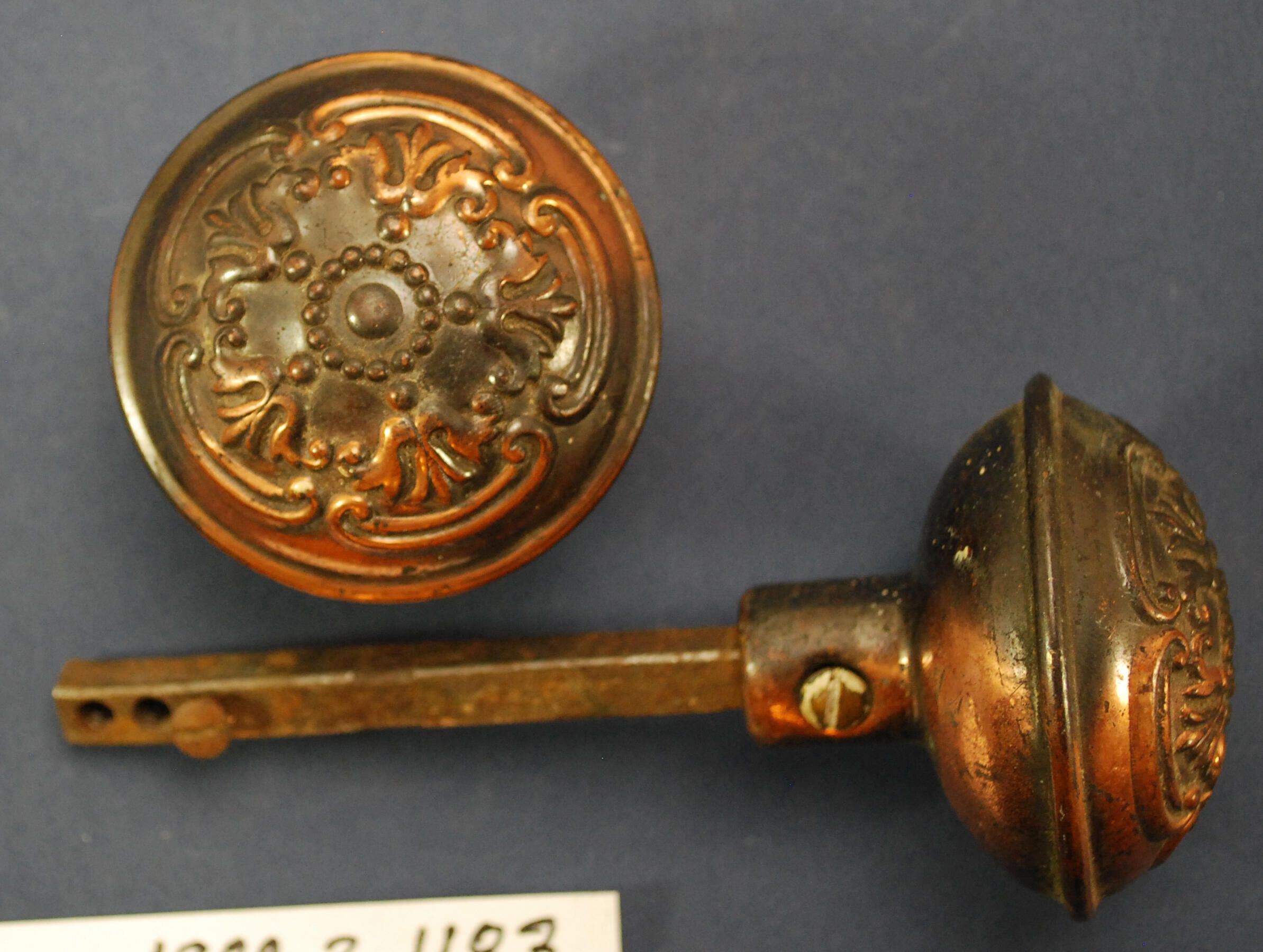 Design Name: Manufacturer: unknown Style: Material: Brass Manufacturing Method: Wrought / Stamped Surface Finish: Antique copper plated VDA Classification: Fivefold symmetry VDA Number: I-114 Shape: Domed Patent Specifics: Lock Type (If Applicable): Inscription/Makers Mark: Inscription Text: Comments: