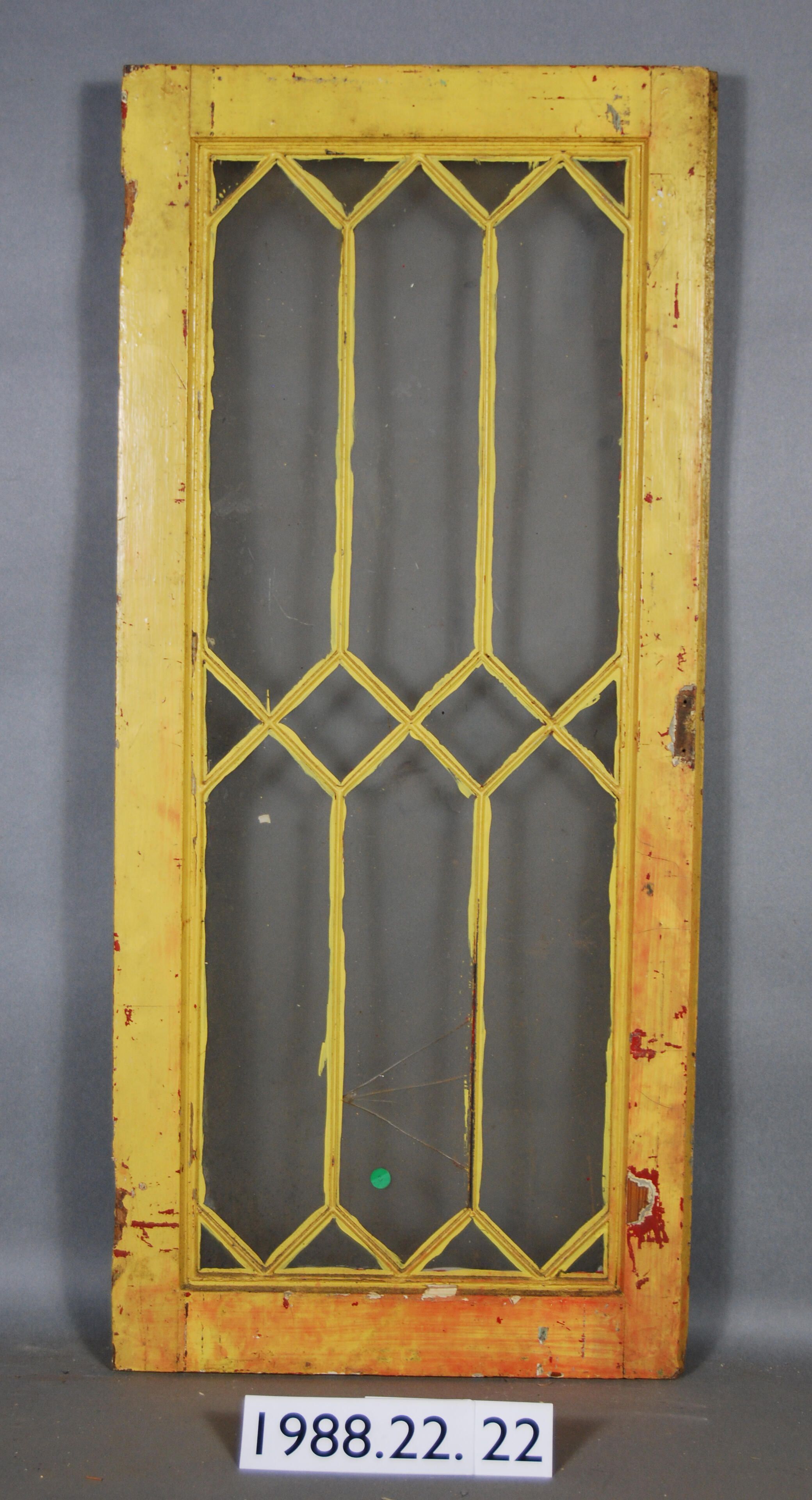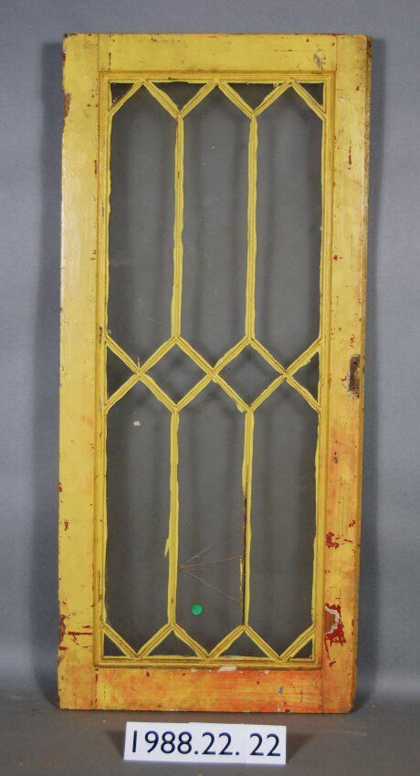 Rectangular. Segmented eighteen openings divided by zinc cames. Sixteen complete glass panes. Two broken panes. Hinges and latch are missing. Has catch on reverse.