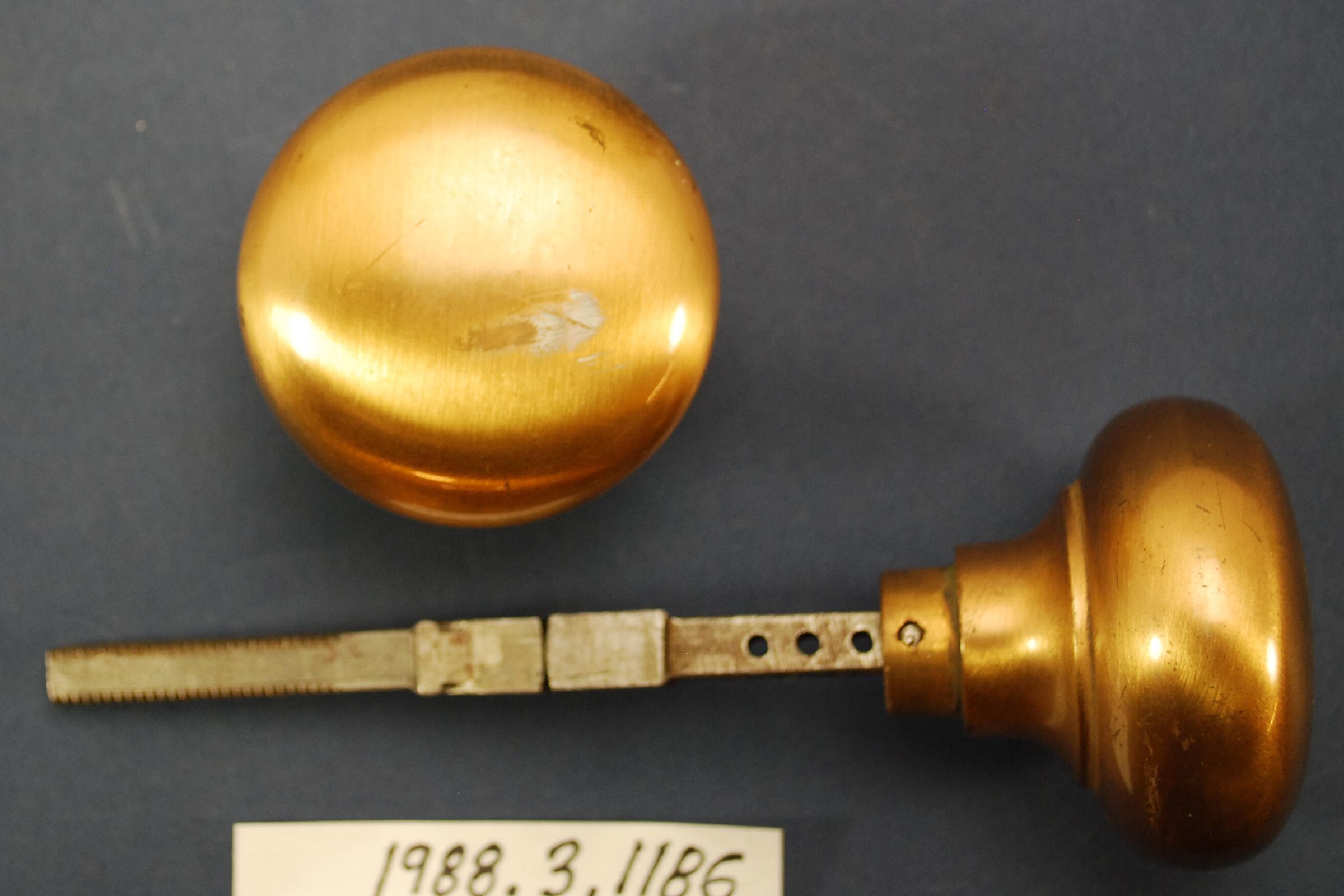 Design Name: Manufacturer: unknown Style: Material: Bronze Manufacturing Method: Cast Surface Finish: Brushed VDA Classification: VDA Number: Shape: Domed Patent Specifics: Lock Type (If Applicable): Inscription/Makers Mark: Inscription Text: Comments: Exterior doorknob, one pair of knobs with spindle.