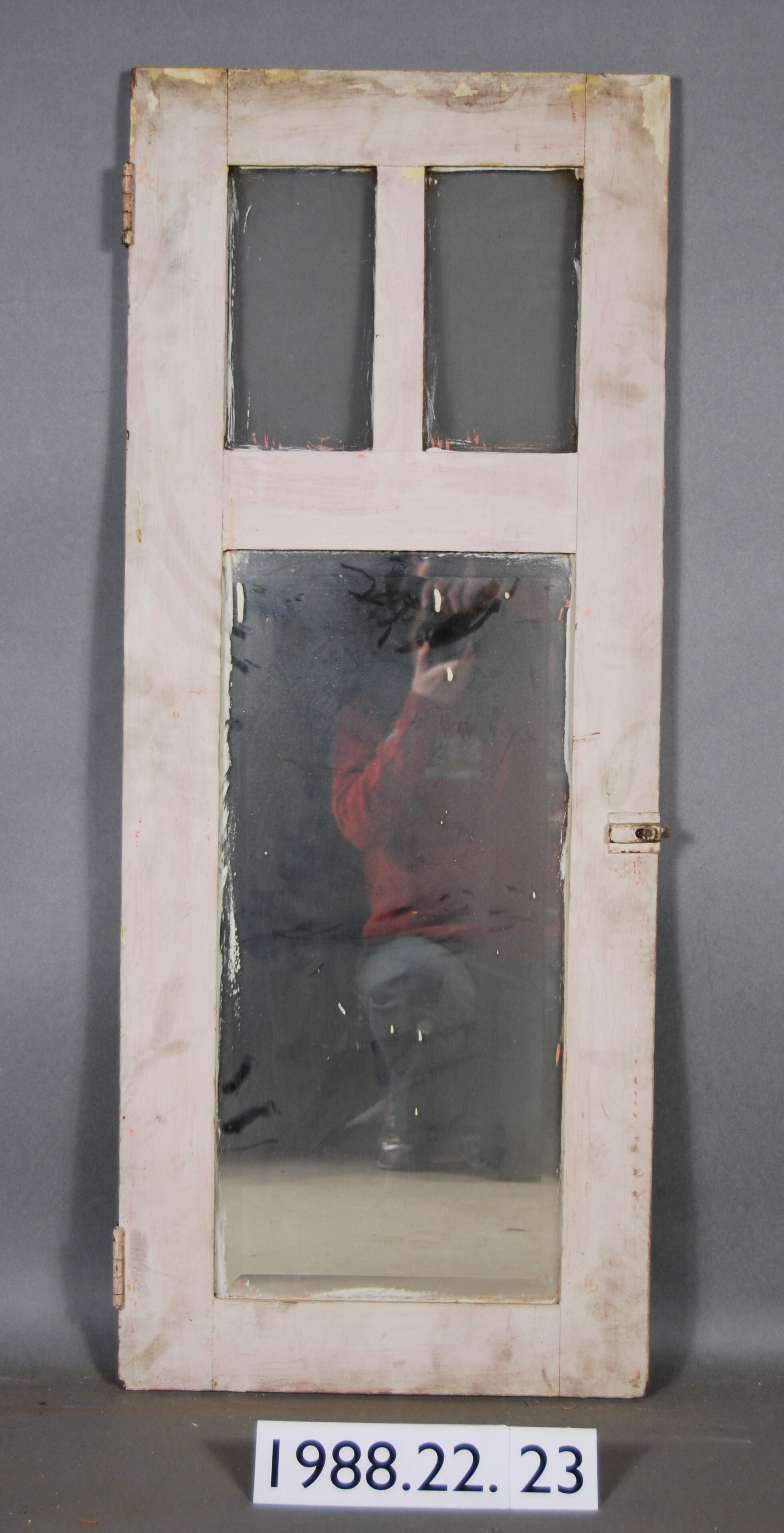 Rectangular. Segmented three openings divided by vertical muntin and horizontal mullion. Upper two openings have complete clear colorless glass panes. bottom opening has complete beveled mirror and plywood backing. Has two complete iron butt hinges. Iron spring latch.
