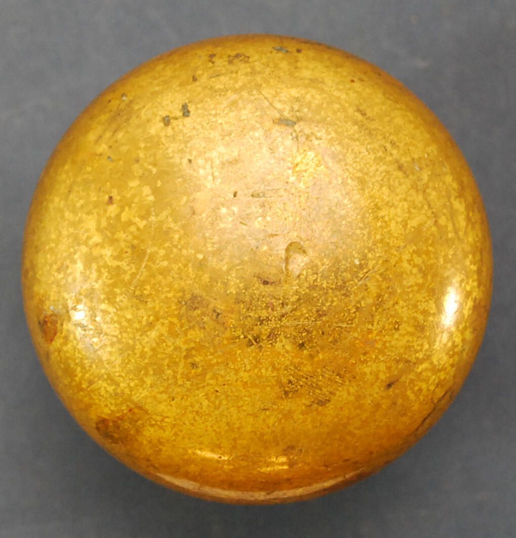 Design Name: Manufacturer: unknown Style: Material: Brass Manufacturing Method: Cast Surface Finish: Aged / Unpolished VDA Classification: VDA Number: Shape: Domed Patent Specifics: Lock Type (If Applicable): Inscription/Makers Mark: Inscription Text: Comments: Copper plating remants.